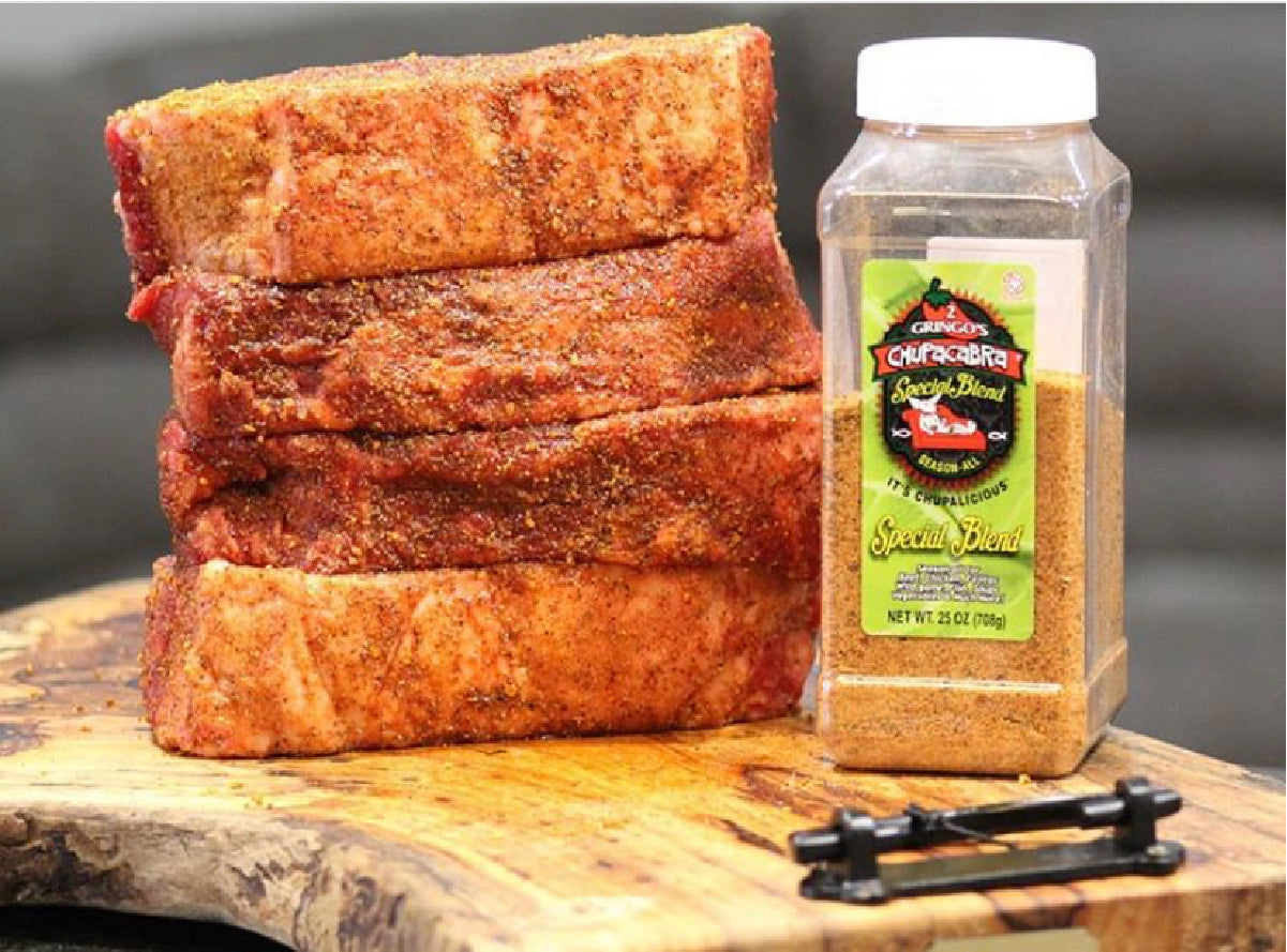 Salt, monosodium glutamate, dehydrated garlic, spices, sugar, paprika, dehydrated onion, brown sugar, 2% or less dehydrated bell peppers, chili peppers, papain, lime oil, lemon oil, citric acid, sodium citrate, and silicon dioxide