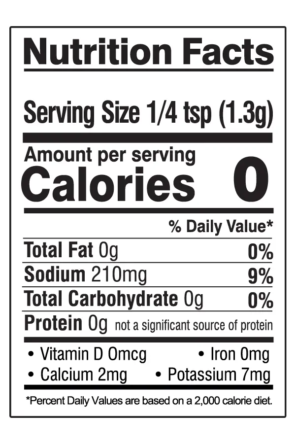 Salt, spices, monosodium glutamate, garlic, sugar, brown sugar, onion, paprika, chili peppers, bell pepper, citric acid, silicon dioxide and lemon oil.