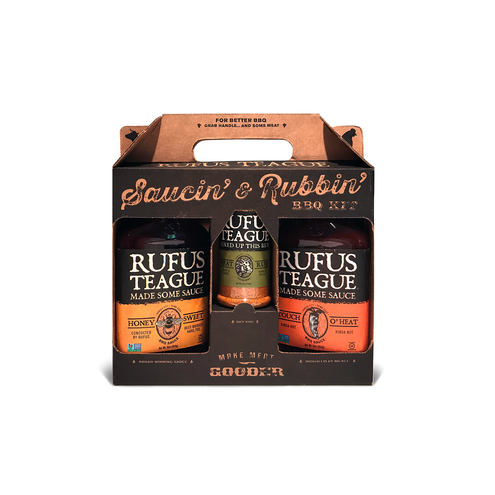 Give someone the gift of Rufus. All nice and purdy in this cool little box. The Saucin' & Rubbin' Gift Tote includes: One Honey Sweet, One Touch O' Heat and One Meat Rub. Aren't you the nice one giving out something so special.