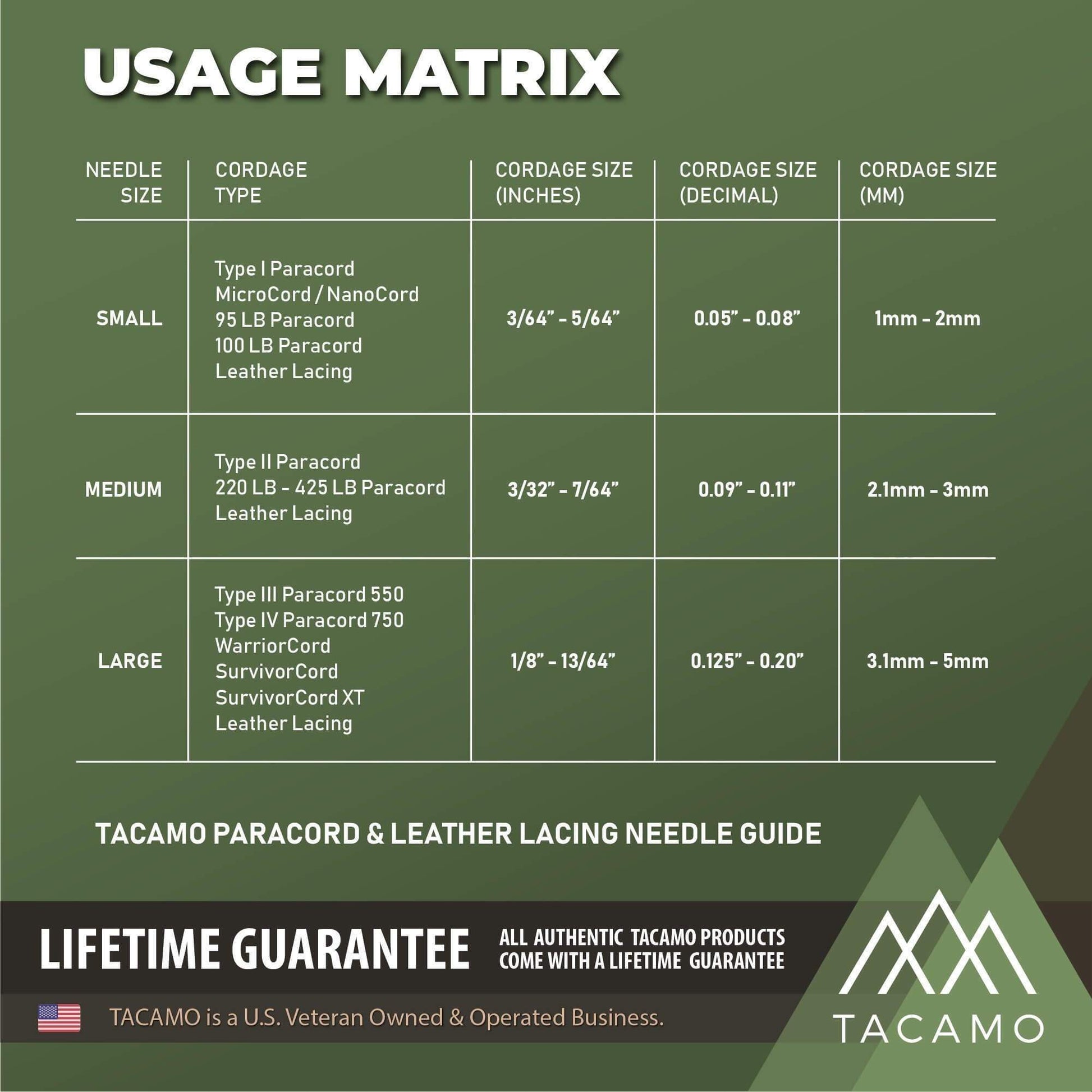 THE BEST TOOLS FOR THE JOB – This TACAMO 7-piece set of professional paracord lacing needles provides you with every tool you need in creating paracord and leather crafts. From super small micro-paracord to larger leather lacing, we’ve got the needle you need.