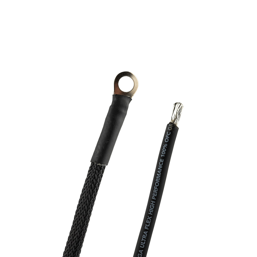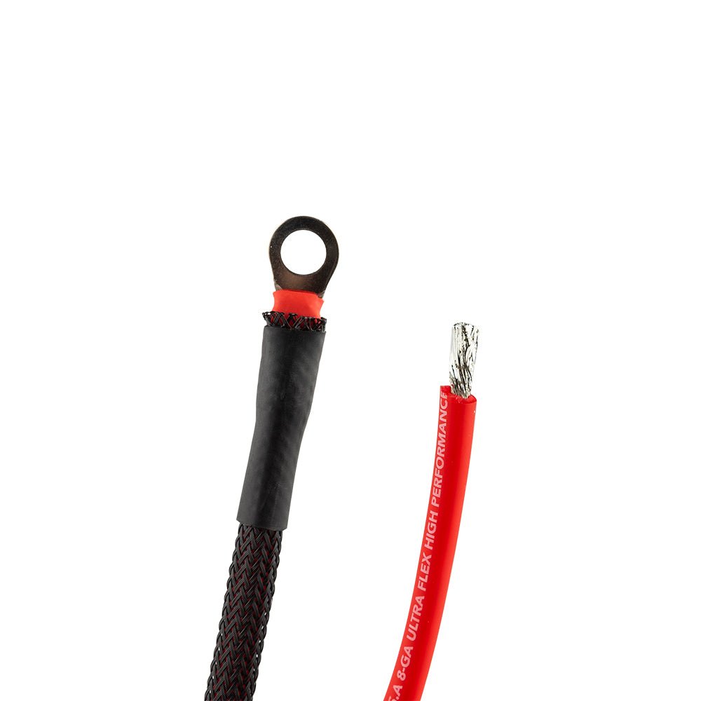 The 8AWG Red (Power) and Black (Ground) OFC Tinned Wire comes in a protective braided sleeve, heat shrink, and ring terminals for added protection against the elements and easier inspection of possible problems.