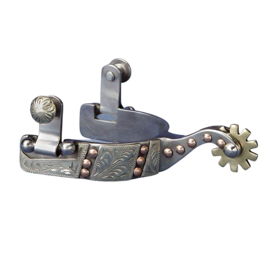 A stainless steel youth spur with a 3/4" band, 2" shank, 1" ten point blunt edge brass rowels and swinging buttons. Nickel silver overlay with brass spots.
