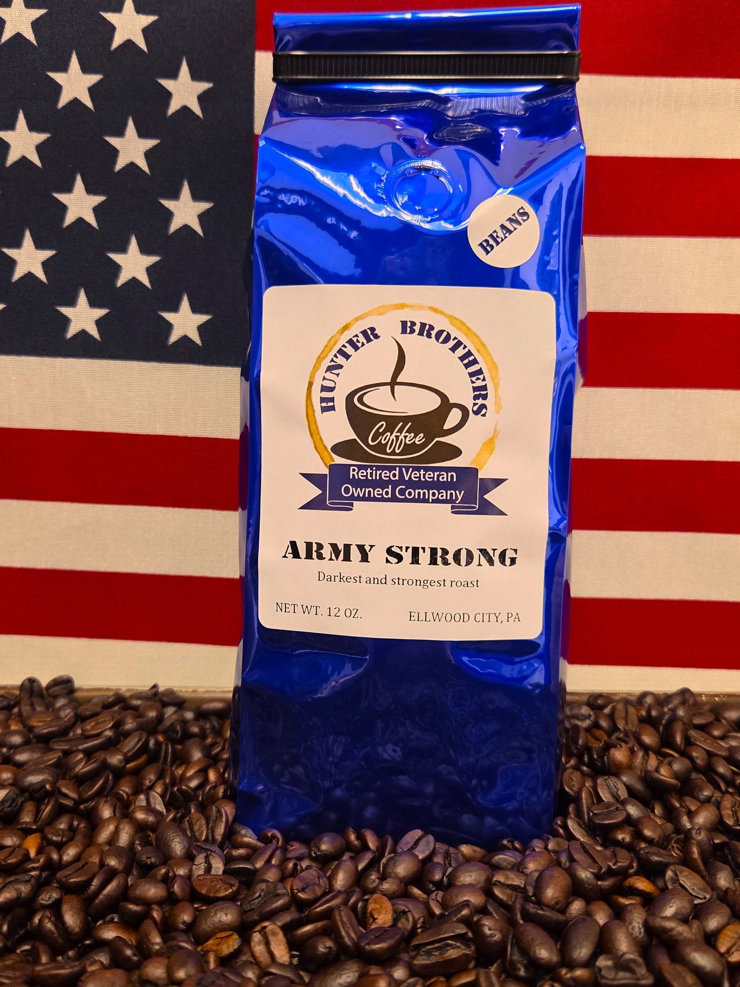 Army Strong, the perfect blend of dark roast coffee for those who need a strong kick to start their day. With its bold flavor and intense aroma, this coffee will keep you fueled and ready for any challenge. Get ready to conquer your day with Army Strong.