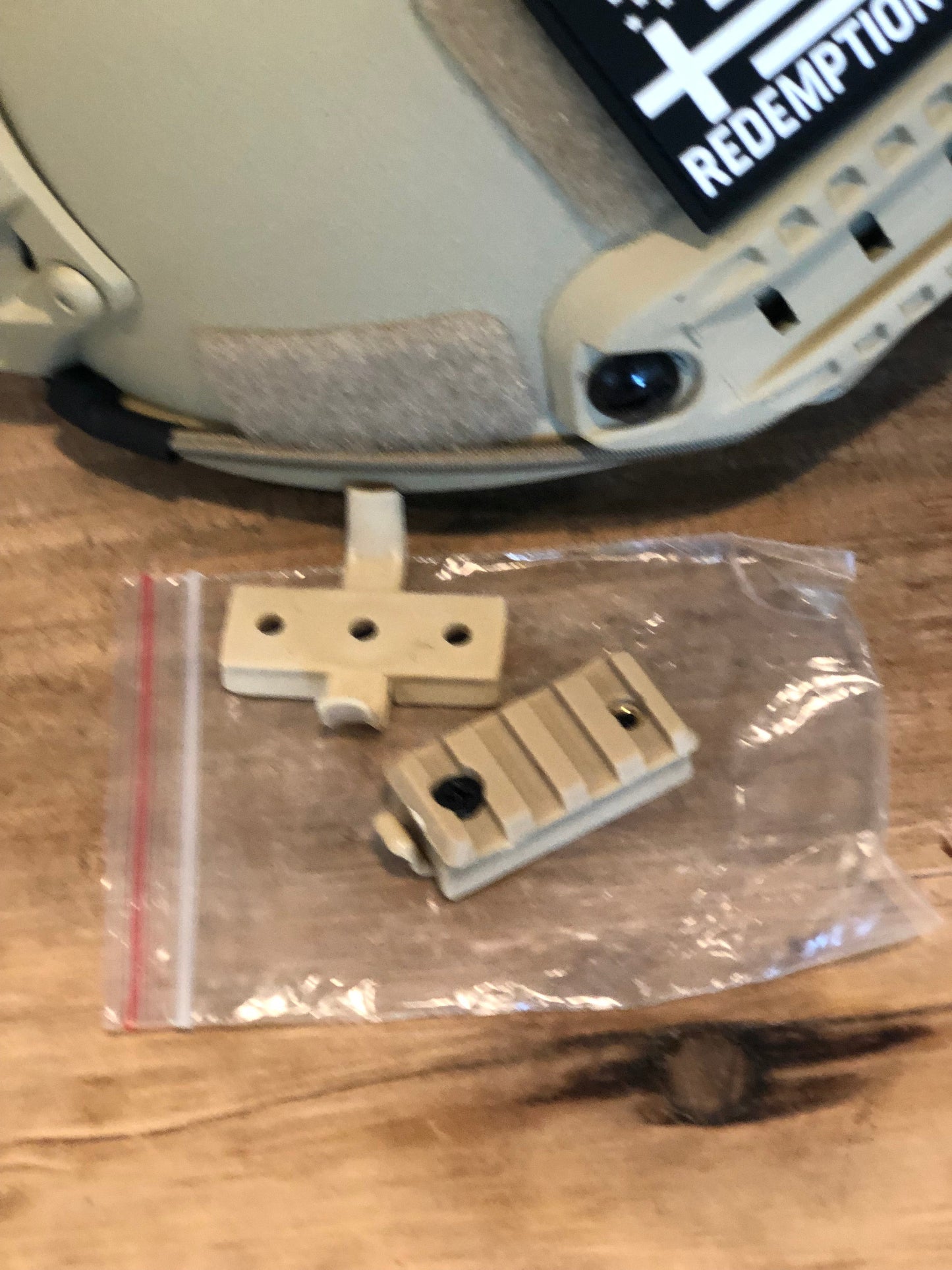 It comes with the Arc rails so that you can attach your lights, headsets, and other gear. It has a universal front NVG Shroud mount to mount your night vision, go pro camera or other gear. It also comes with a Picatinny Arc Rail adapter mount and Wing-Loc adapter that you can mount your flashlight etc to them.