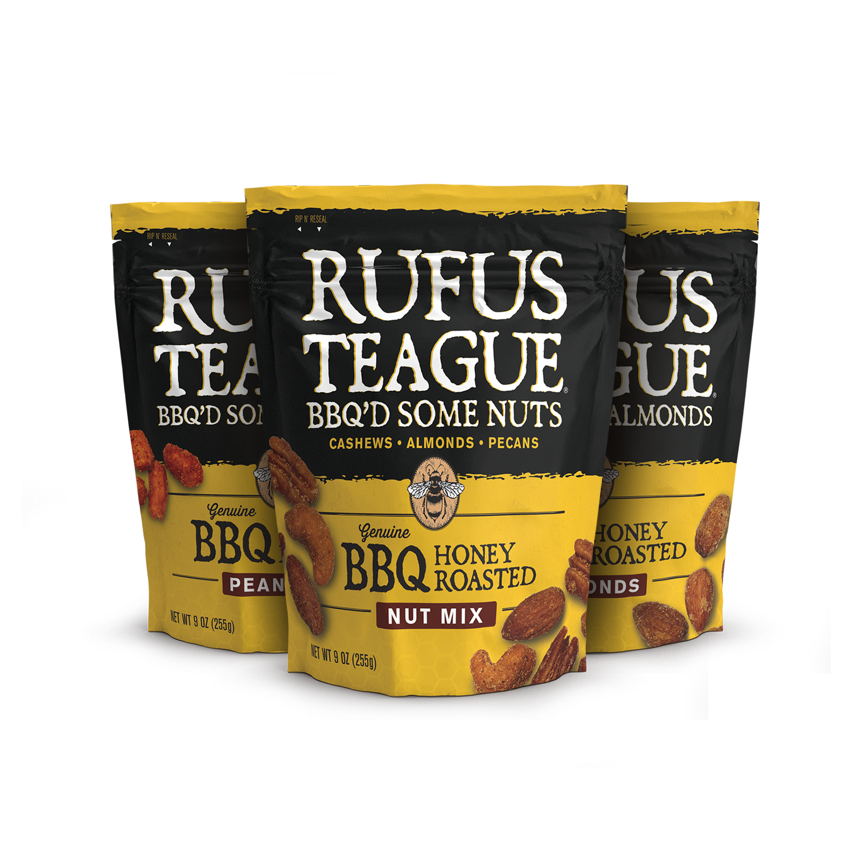 BOOM! Get all THREE varieties of Genuine BBQ Nuts. All are honey roasted and coated in Rufus’ legendary Honey Sweet BBQ goodness. Each comes in a stay-fresh pouch that’s resealable, as long as you can force yourself to stop eating long enough to zip it.