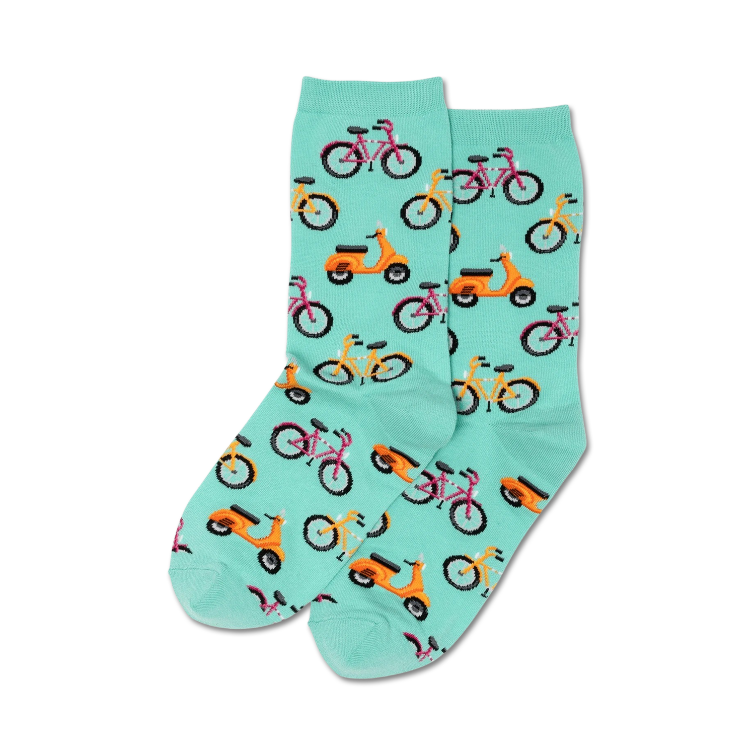 Two-wheeling through life in style with our Bike and Vespa Crew Socks for women! These socks have a pattern of orange and pink bicycles and yellow scooters on a cool mint green background. Pedal your way through the fashion world with a reminder that life can be a smooth ride. And remember, if you ever feel like you're stuck in a rut, just look down at your socks and remember that there's always a new adventure waiting for you, just around the bend!