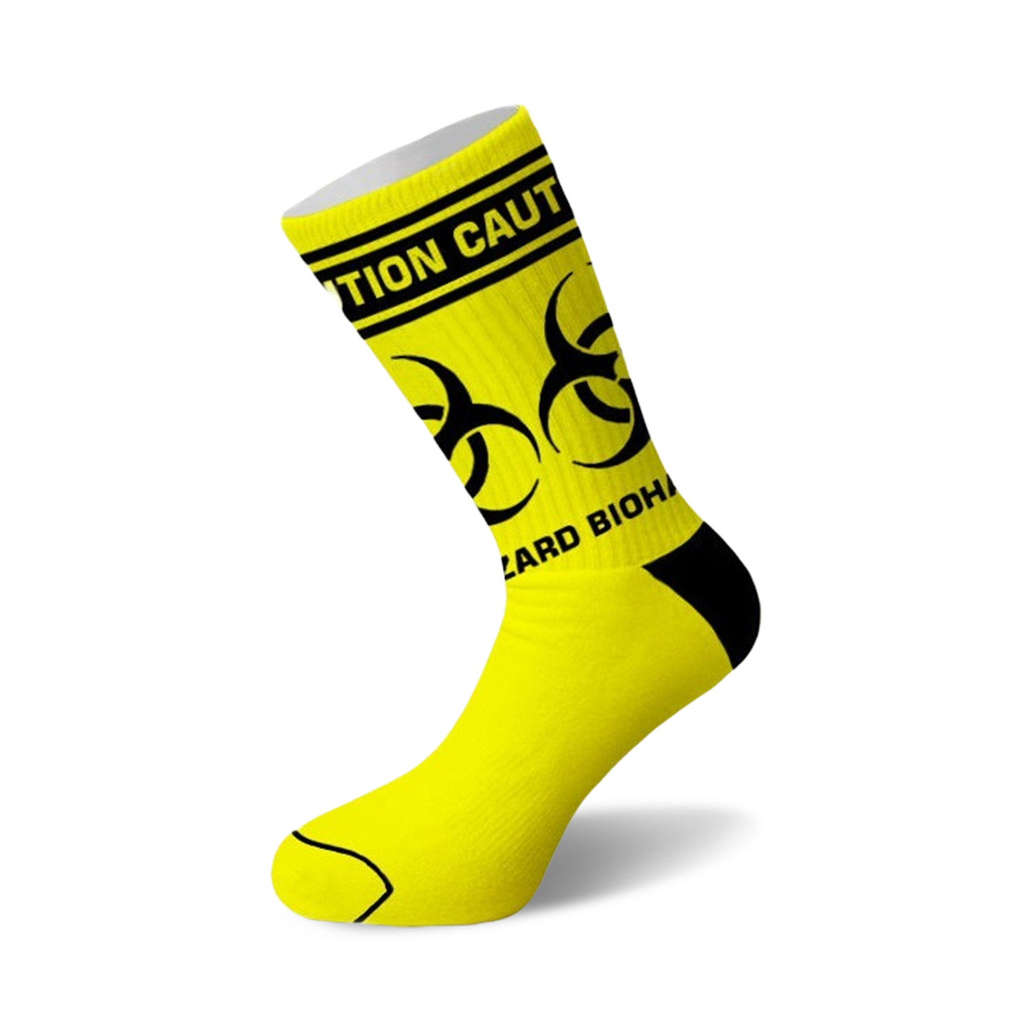 Unleash your inner scientist with the Biohazard Crew Socks! This pair of socks is a perfect blend of style and humor with its bold yellow color contrasting against black toes, heels, and cuffs. Put on these bad boys and show off the black biohazard symbol and the word 'CAUTION' screaming from the cuffs. Let the world know you're not afraid to take risks!
