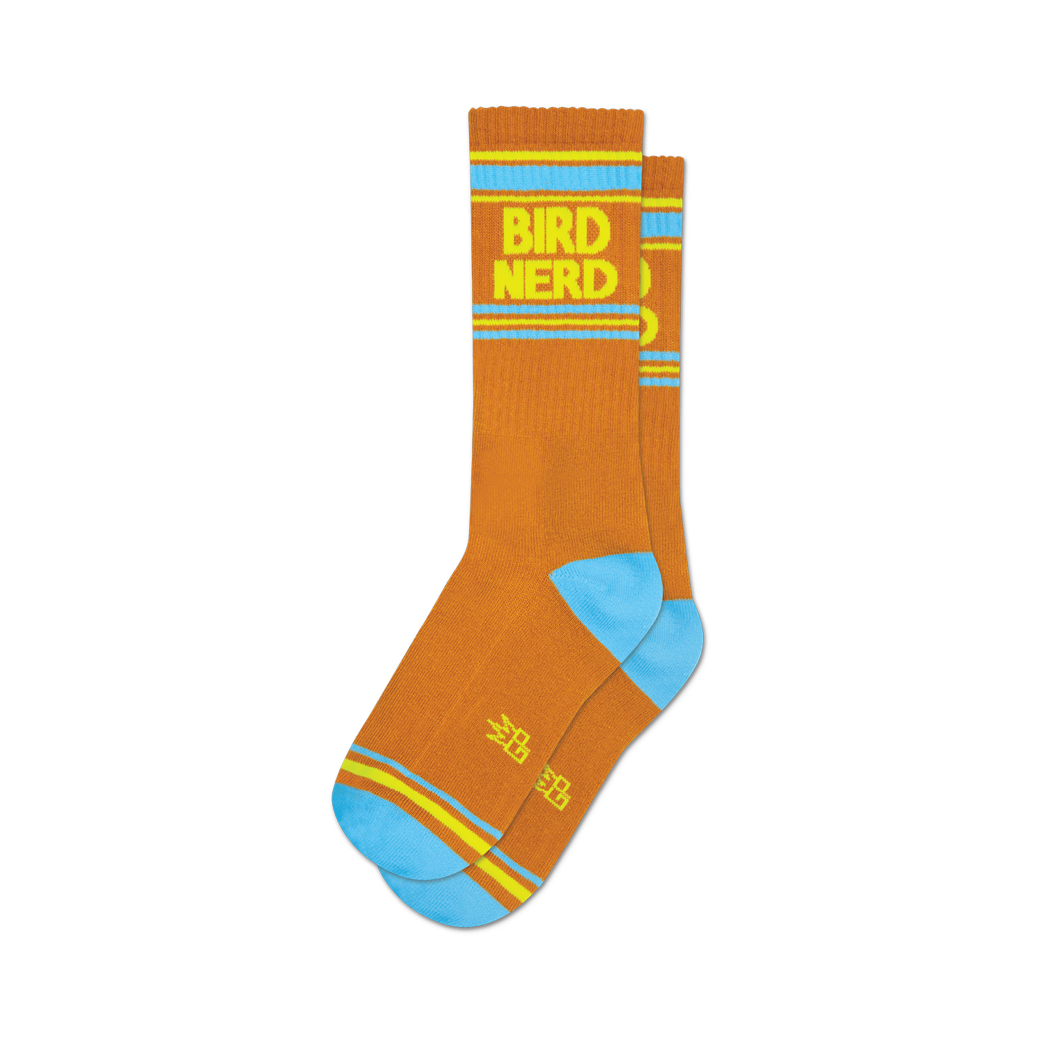 Let your feet do the squawking with these orange socks, flanked by blue and yellow accents that sing a tune louder than a morning chorus. Adorned with "bird nerd" in vibrant yellow script along the leg, they're a shout-out to anyone who believes binoculars are just as essential as coffee in the morning. Perfect for perching on the sofa or nesting in your favorite reading nook, these socks are a cozy tribute to the feathered friends who never fail to amuse. Who needs a peacock's flair when your ankles are this eye-catching?