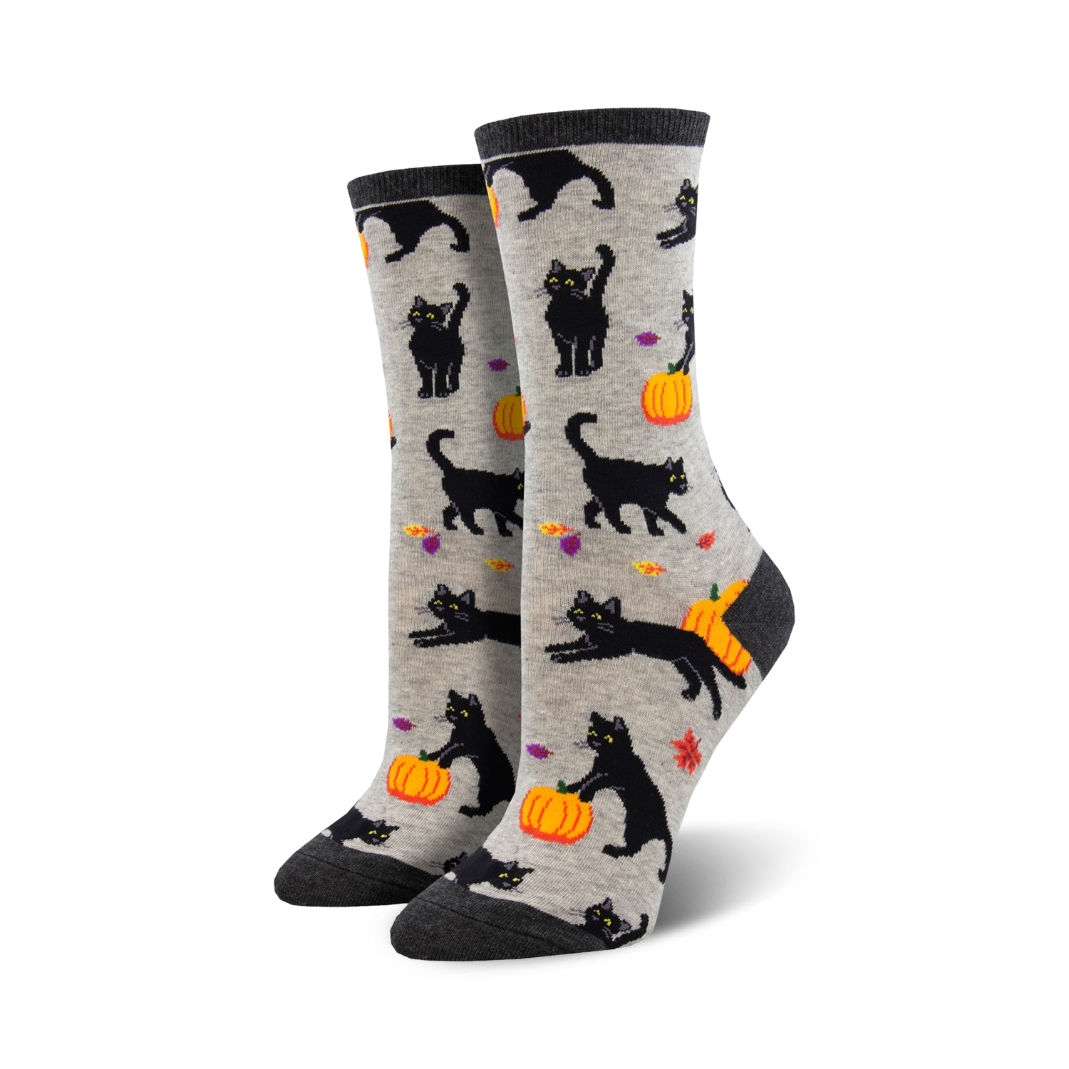 These gray crew socks will make you "fall" for Halloween with their adorable black cats, pumpkins, and leaves in bright orange, yellow, and green. Your feet will never feel bored again!