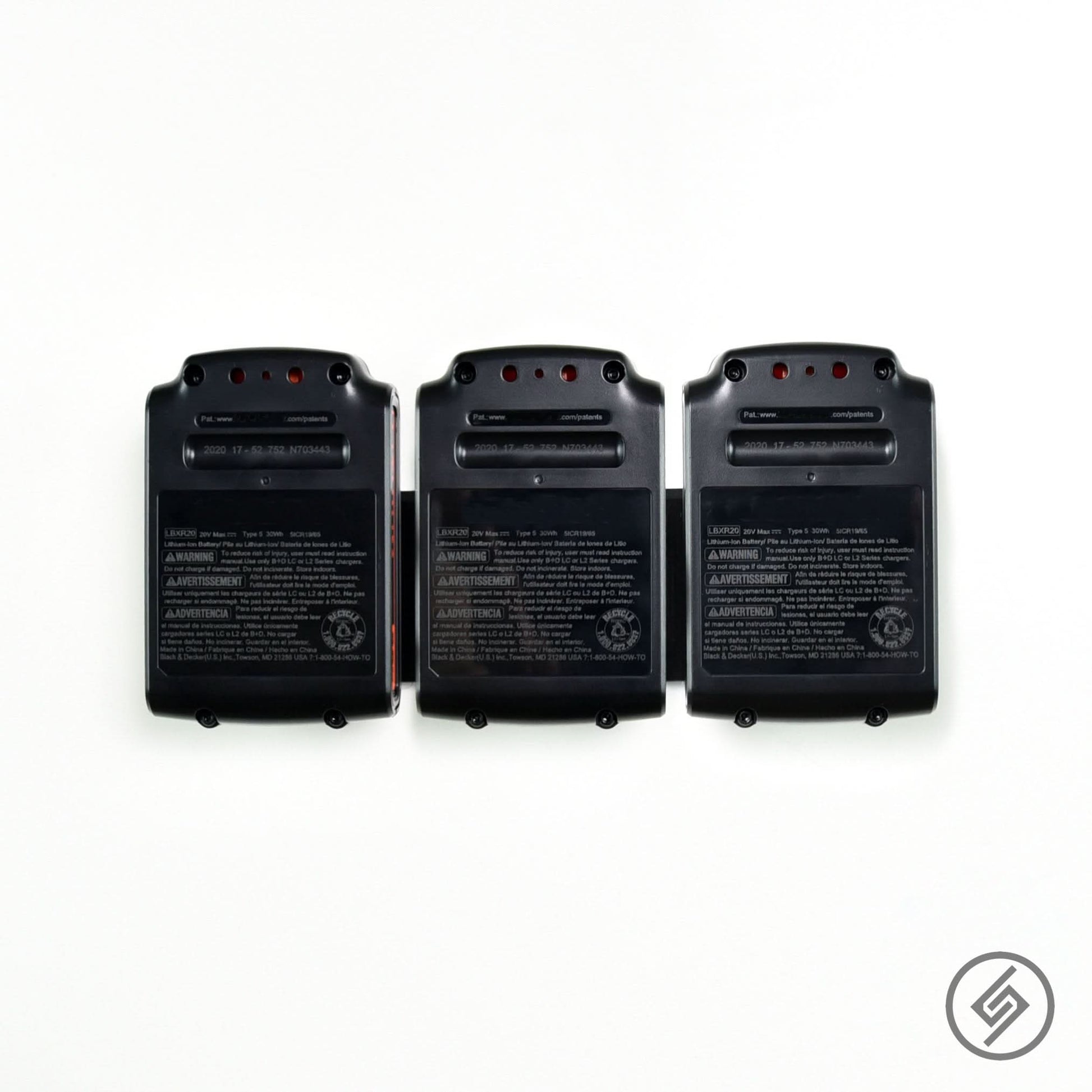 Keep your Black & Decker 20V batteries organized and ready with our custom wall mount. Perfect for garages, workshops, or mobile tool setups, it holds your batteries securely for easy access and clean storage. Built tough in the USA to handle daily use by DIYers and professionals alike.