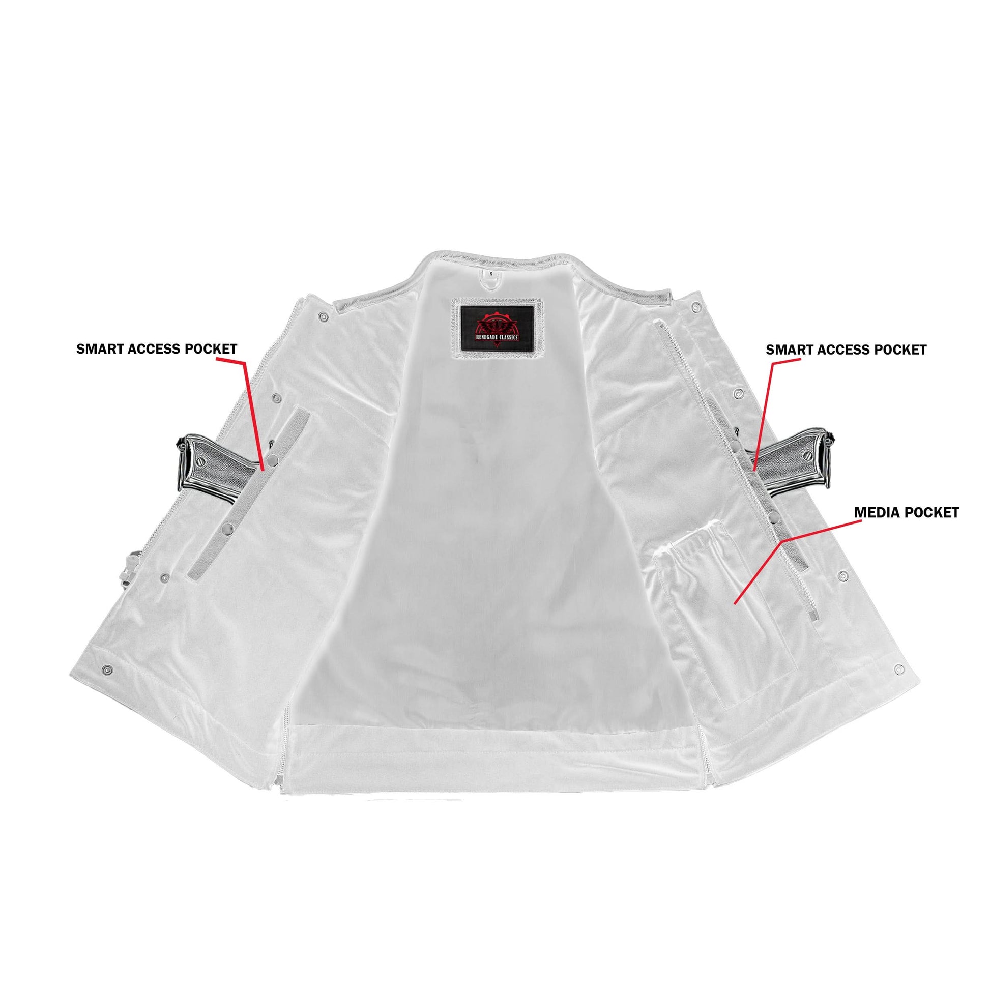 2 upgraded style concealed gun pockets between the snap and the zipper made of special heavy-duty textile with built-in holsters and snap closure.