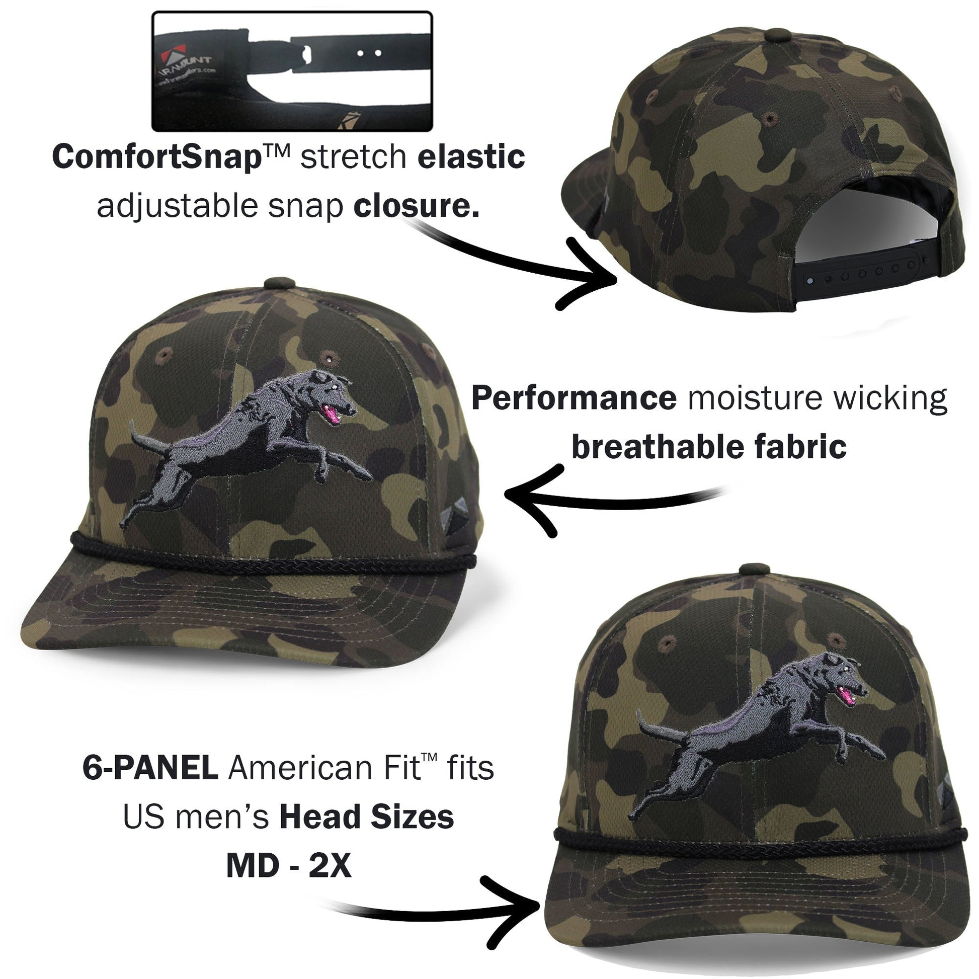 This Black lab rope cap is built on our Riverside 6-panel baseball cap style. Featuring a performance moisture wicking fabric with structured front panels and quality 10k stitch count dog embroidery. Our COMFORT SNAP™ closure couple the stretch of elastic with the adjustability of a snapback. Lastly, This new black lab hat features American Fit™ sizing which fits men's head sizes MD - XX.