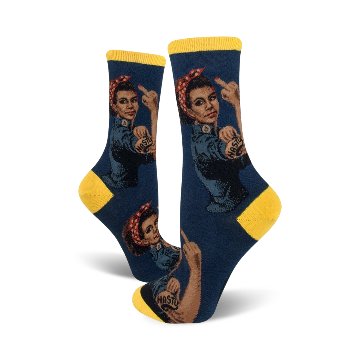 Exhibit fierce feminist vibes with our Black Nasty Rosie socks! Rosie's iconic middle finger salute becomes a powerful statement on these classic crew socks, infused with unstoppable girl power energy!