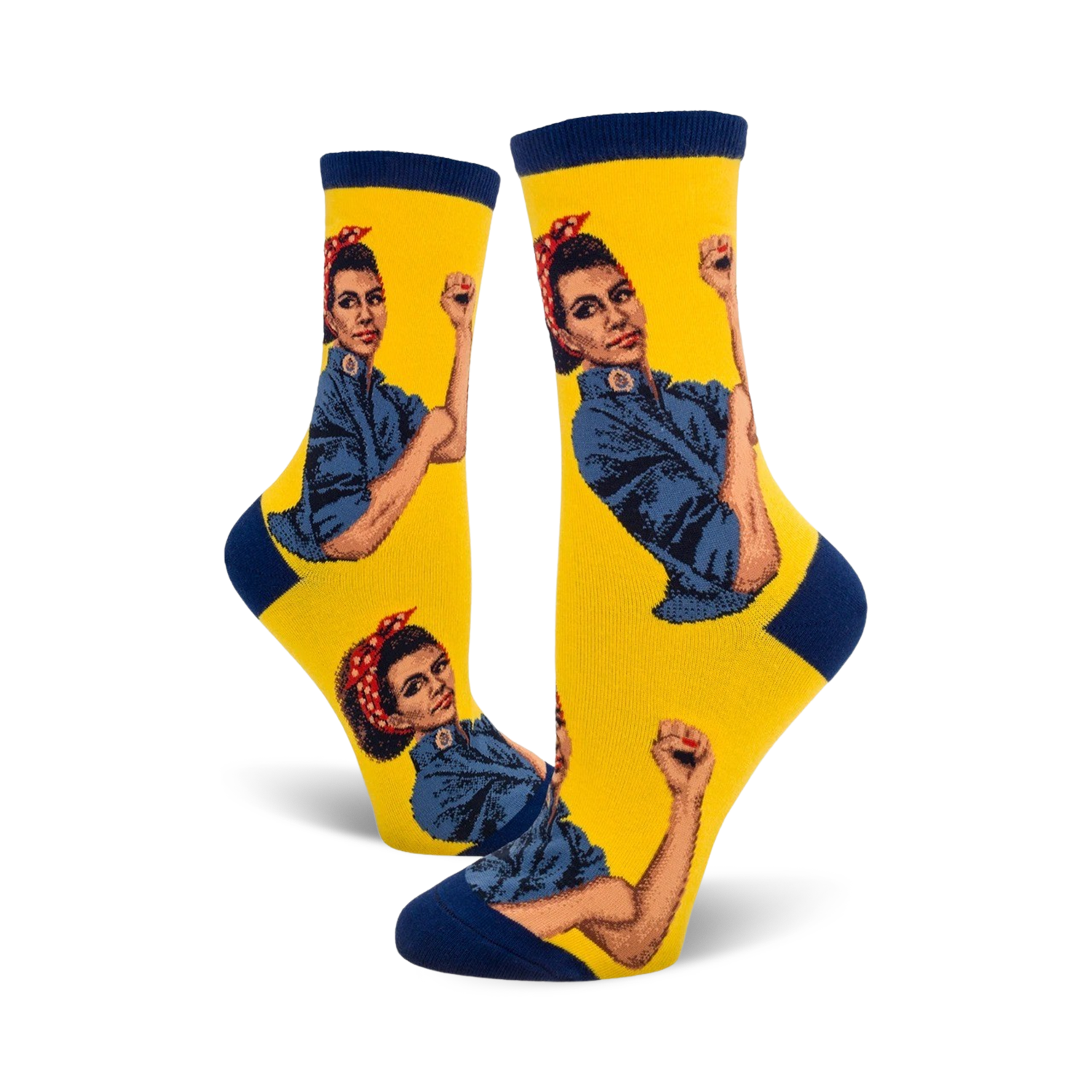 Flex your female empowerment with our boldly designed Black Pride Rosie socks, featuring the iconic image of Rosie the Riveter in vibrant shades of yellow and red. Slip into these crew-length socks and let the symbol of girl power remind you that you can conquer any challenge that comes your way.
