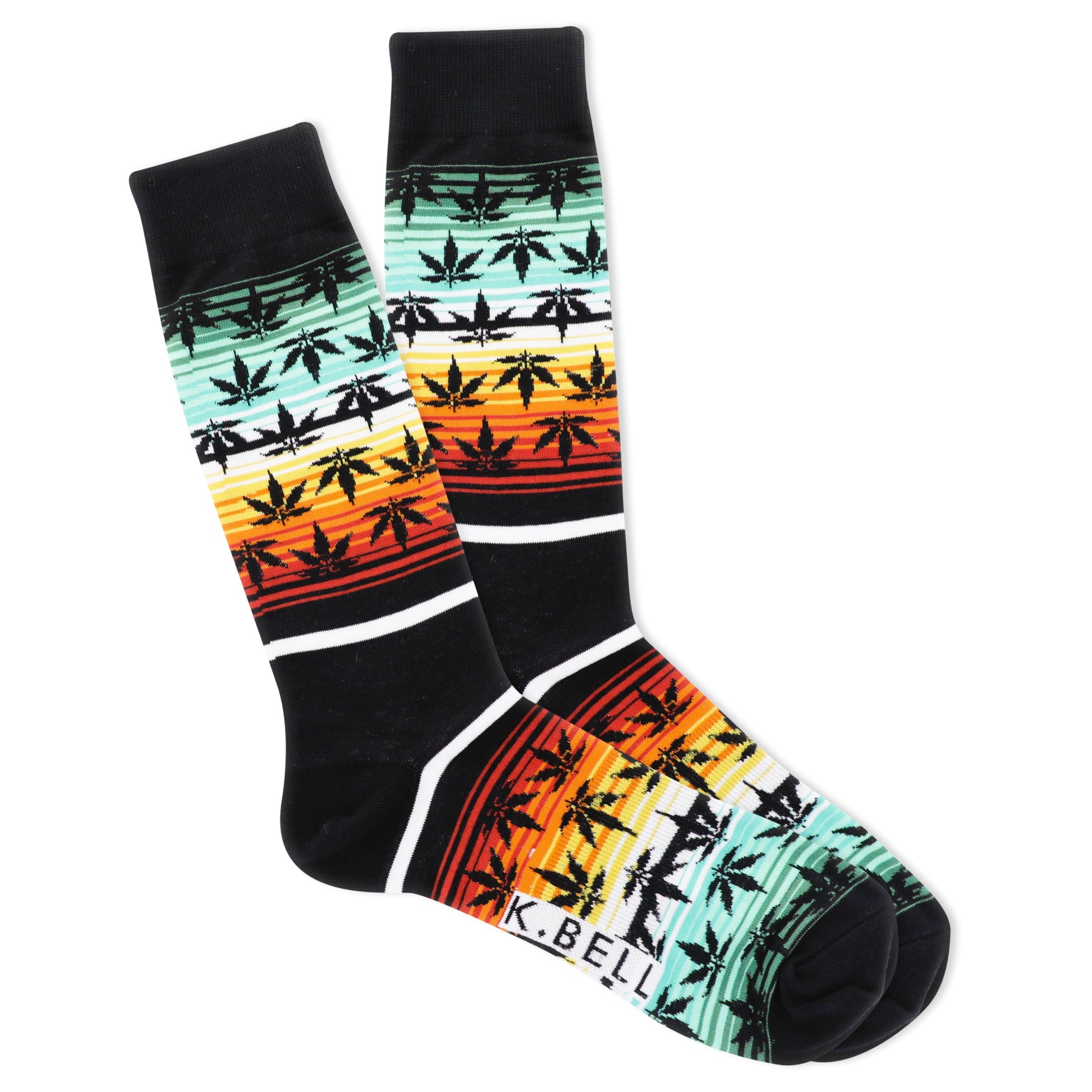Meet the Blanket Bud socks. They're crew socks with a black base and a neat pattern: horizontal stripes in sunset colors – orange, red, yellow, and teal – are broken up by rows of dark-green marijuana leaves. The leaves are a simple, silhouette-style design. The visible parts of the sock's foot area show the same pattern. These are definitely statement socks – comfy and eye-catching.