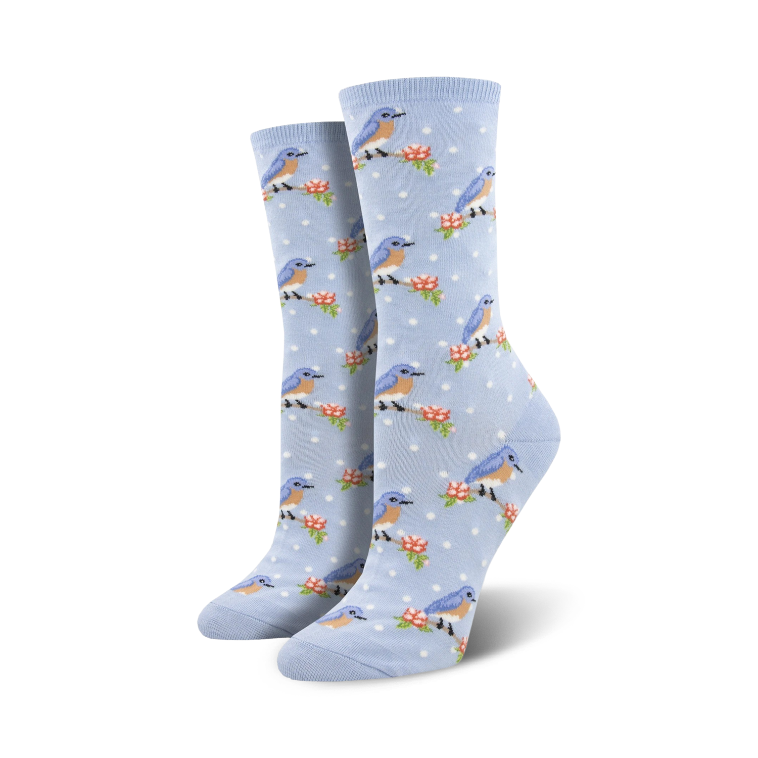 Get on a bluebird adventure and let your feet fly in these vibrant socks. Soar above the ordinary with adorable bluebirds perched on blooming branches, because life's more fun when your socks have personality. Each pair is a masterpiece, with a splash of wings and hints of pink and green. These quirky socks are a conversation-starter, a mood-booster, and an homage to nature's little cheerleaders. Slip into a pair today and tweet your way to happiness.