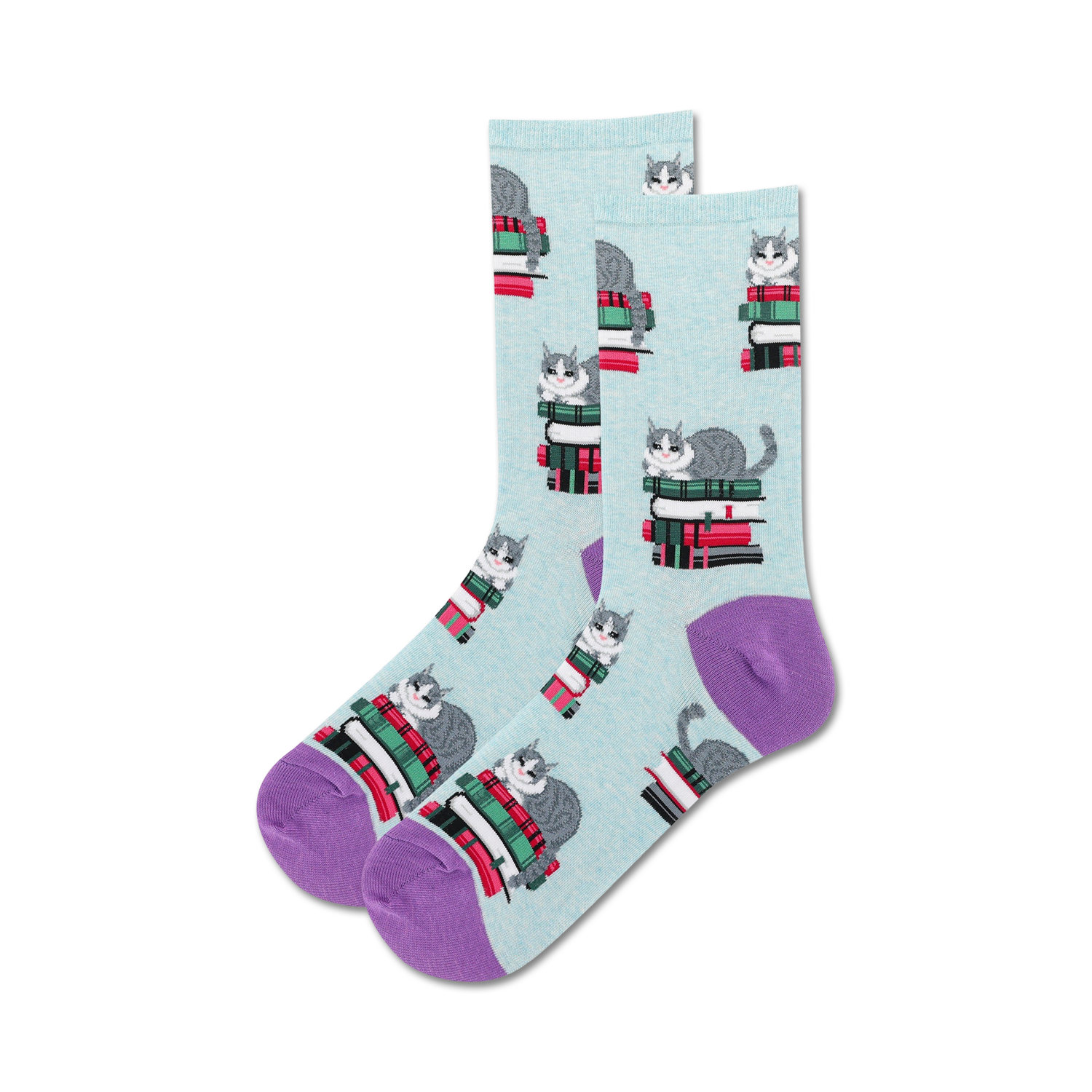 These Book Cat Crew Socks will make you the cat's meow! These fun and energetic womens' crew-length cat-themed product feature a pattern of adorable light blue and gray book-loving felines, each wearing a cute purple collars as they lay stretched out over various brightly-colored books such as red, green, blue, and orange. Slip on a pair of Book Cat Crew Socks next time you need a cute and perky pick-me-up to match your favorite bookish getup, and get ready to start turning heads and cracking smiles!
