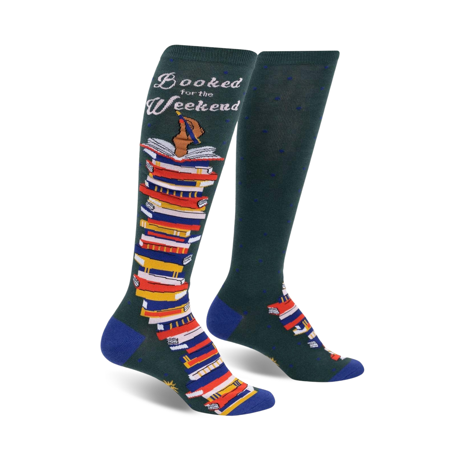If books are your happy place and you love to get lost in a good story, these 'Booked for the Weekend' knee-high socks will speak to your inner literary lover. With a fun pattern of colorful books and a stack of books design, you'll be ready for your next reading adventure as soon as you slip them on. Whether you're curled up with a classic novel or diving into the latest bestseller, these socks will remind you that there's no better way to spend a weekend.