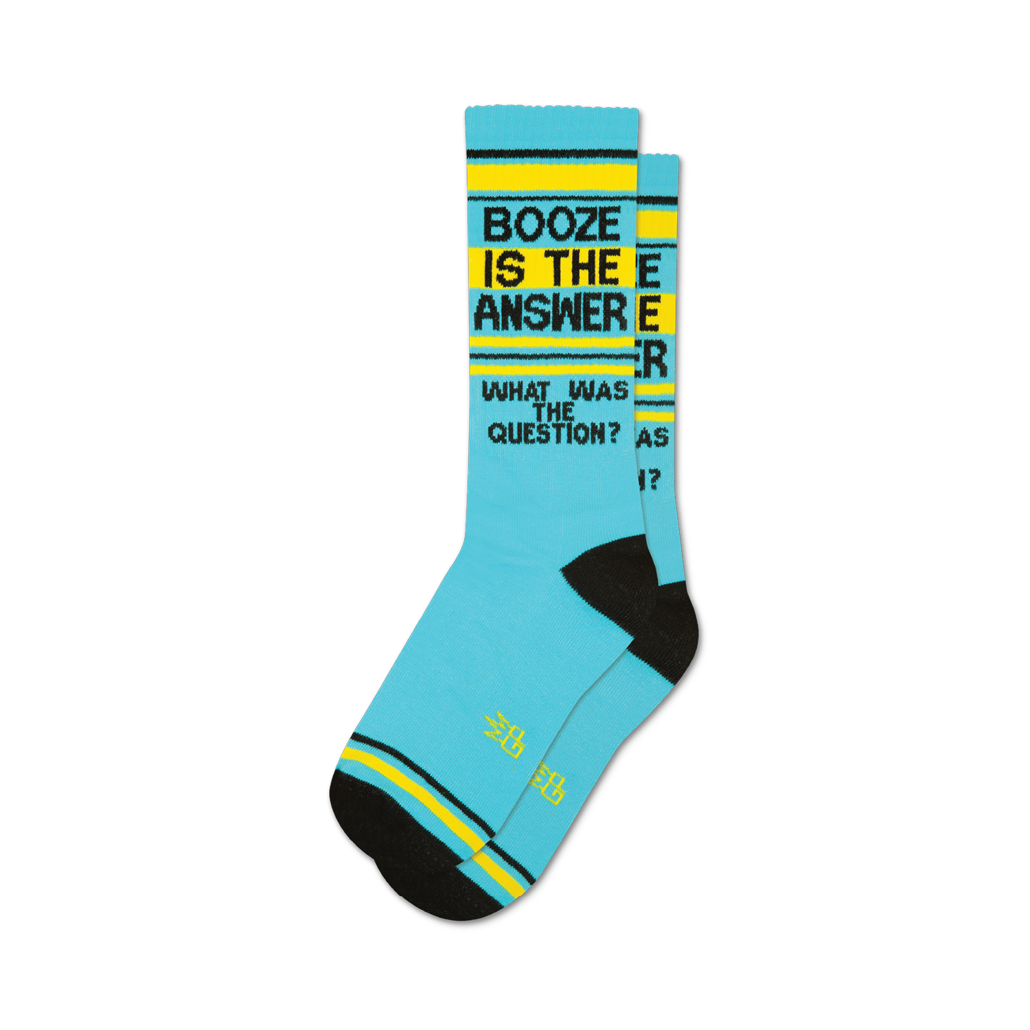 Raise a glass to the Booze is the Answer socks! Let your feet do the talking in these playful blue socks with black toes, heels, and cuffs. Featuring bright yellow stripes and the words "Booze Is The Answer" on one sock and "What Was The Question?" on the other, these socks are sure to make a statement. Whether you're hitting the town or kicking back at home, these socks are the perfect way to show off your love for a good time. Remember, the answer is always booze! Socks sold as pairs.