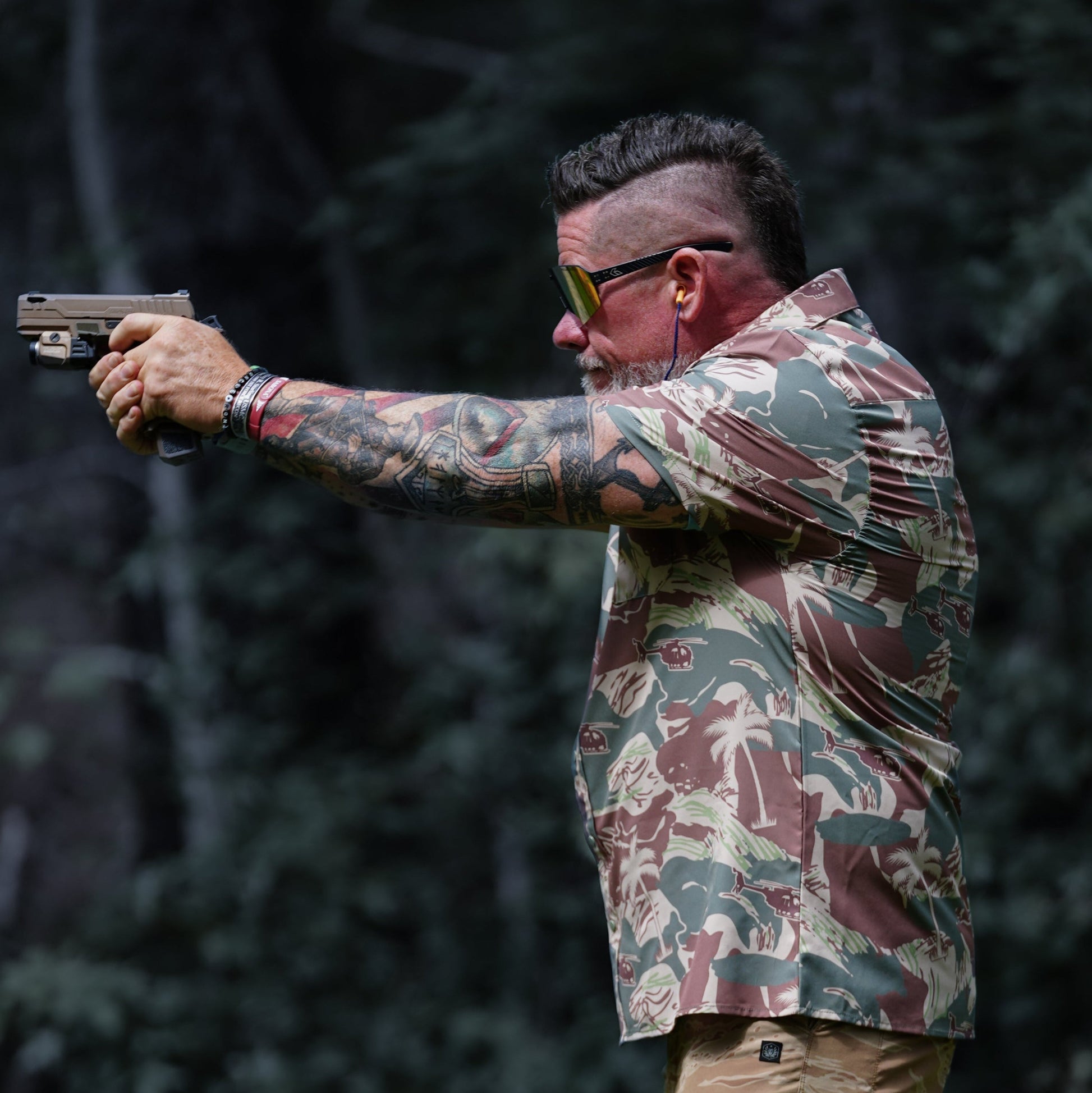 Stay sharp and comfortable with the Brushstroke button-up, designed for those who demand performance and style. Crafted from a durable polyester/spandex blend, this short-sleeve oxford features a relaxed fit and snap buttons for quick action. Its weighted inner pockets ensure a smooth sweep-to-weapon motion (weight not included), while the breathable fabric keeps you cool. The multi-color green and tan camo pattern adds tactical edge, making it perfect for any mission—whether with the family or the crew.