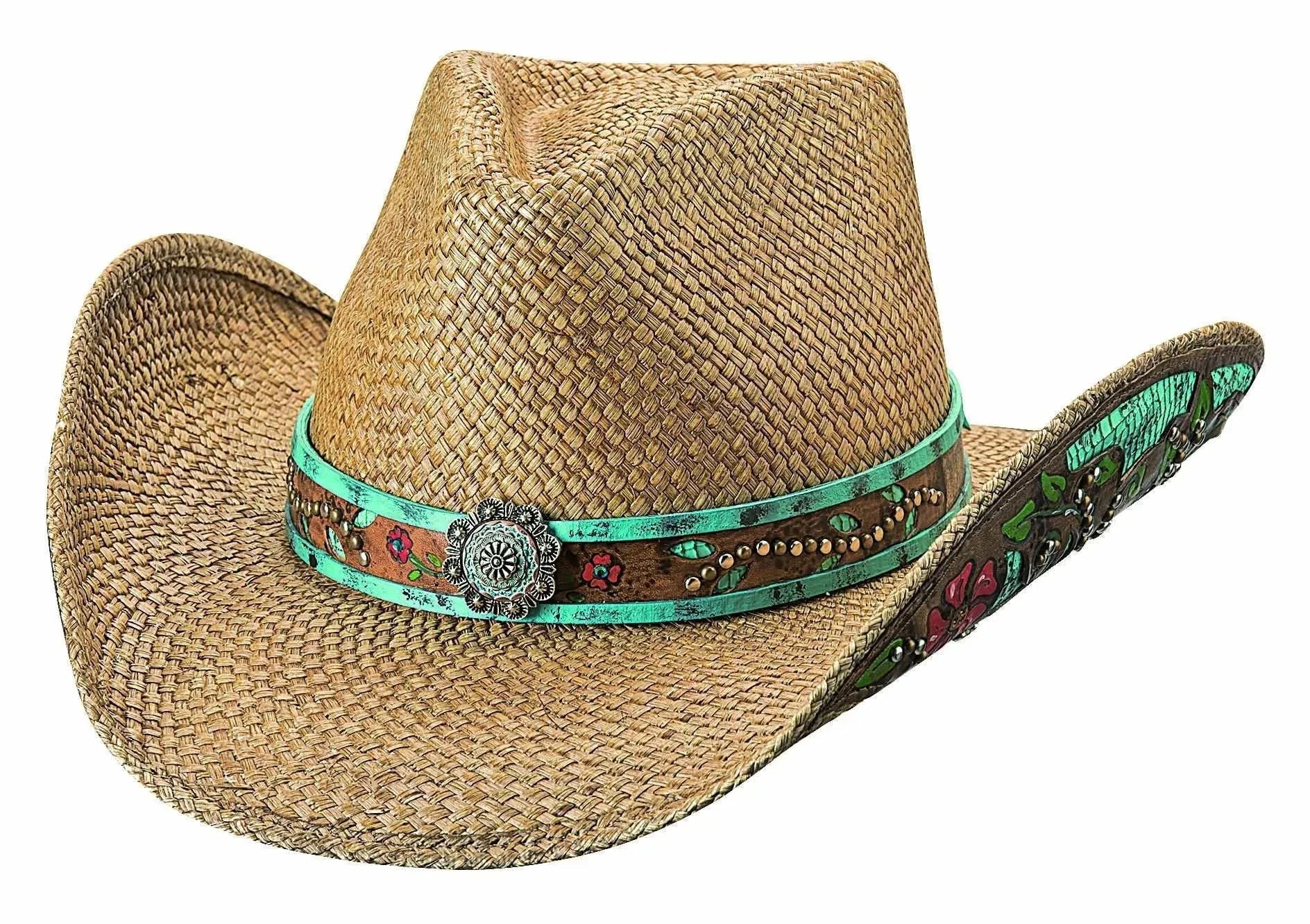 • Floral Concho Having fun in the warm weather summer brings. The Trust Myself by Bullhide from Montecarlo is the perfect hat. This hat features geniune panama straw material, pinchfront crown, a studded and floral overlay underneath, matching the hatband with a flower;like concho.