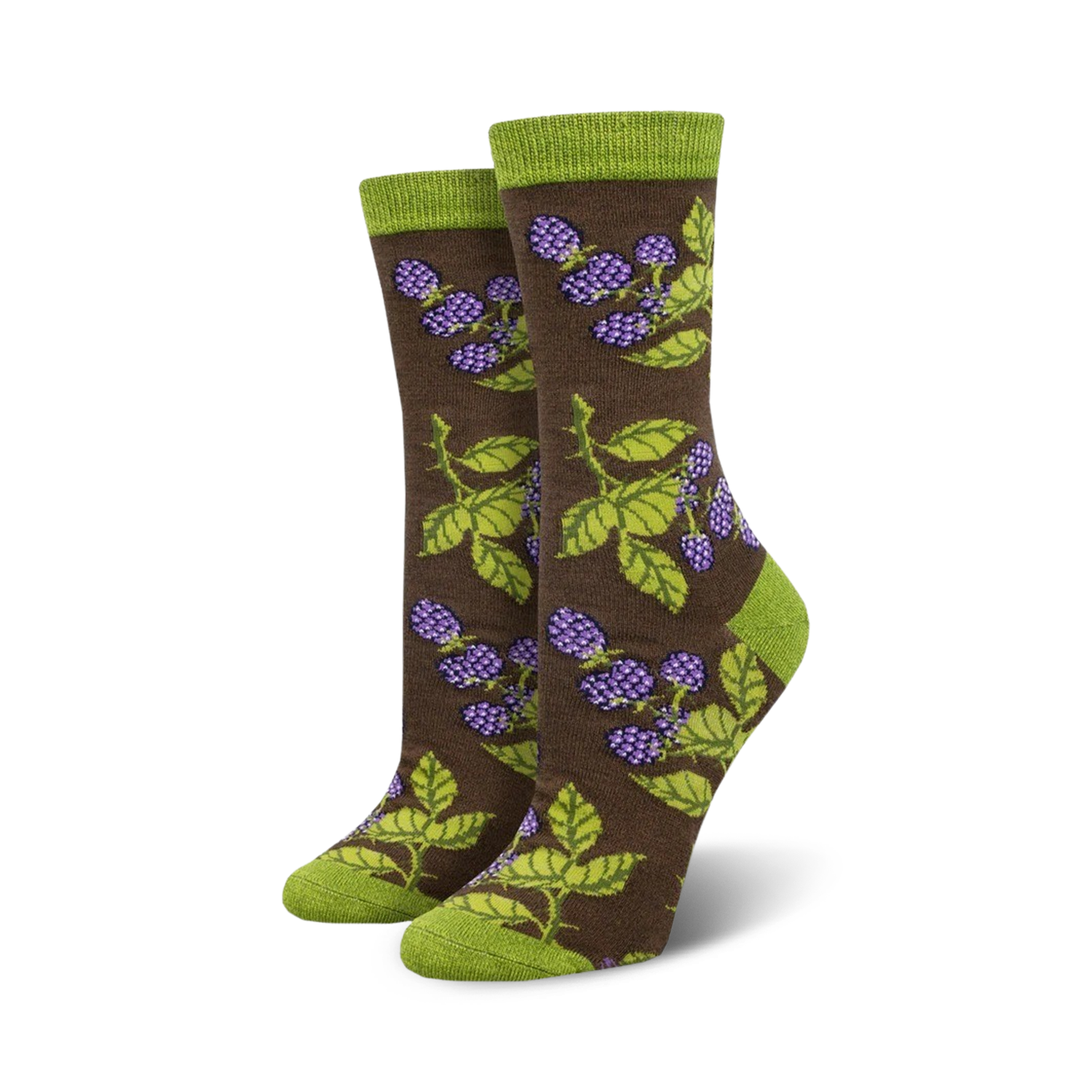 Calling all nature lovers! The Bunch of Blackberries Bamboo socks feature a whimsical pattern of green leaves and purple blackberries on a brown background. These socks are meant to be seen, so go ahead, flaunt them! Take a walk on the wild side and grab your pair today.