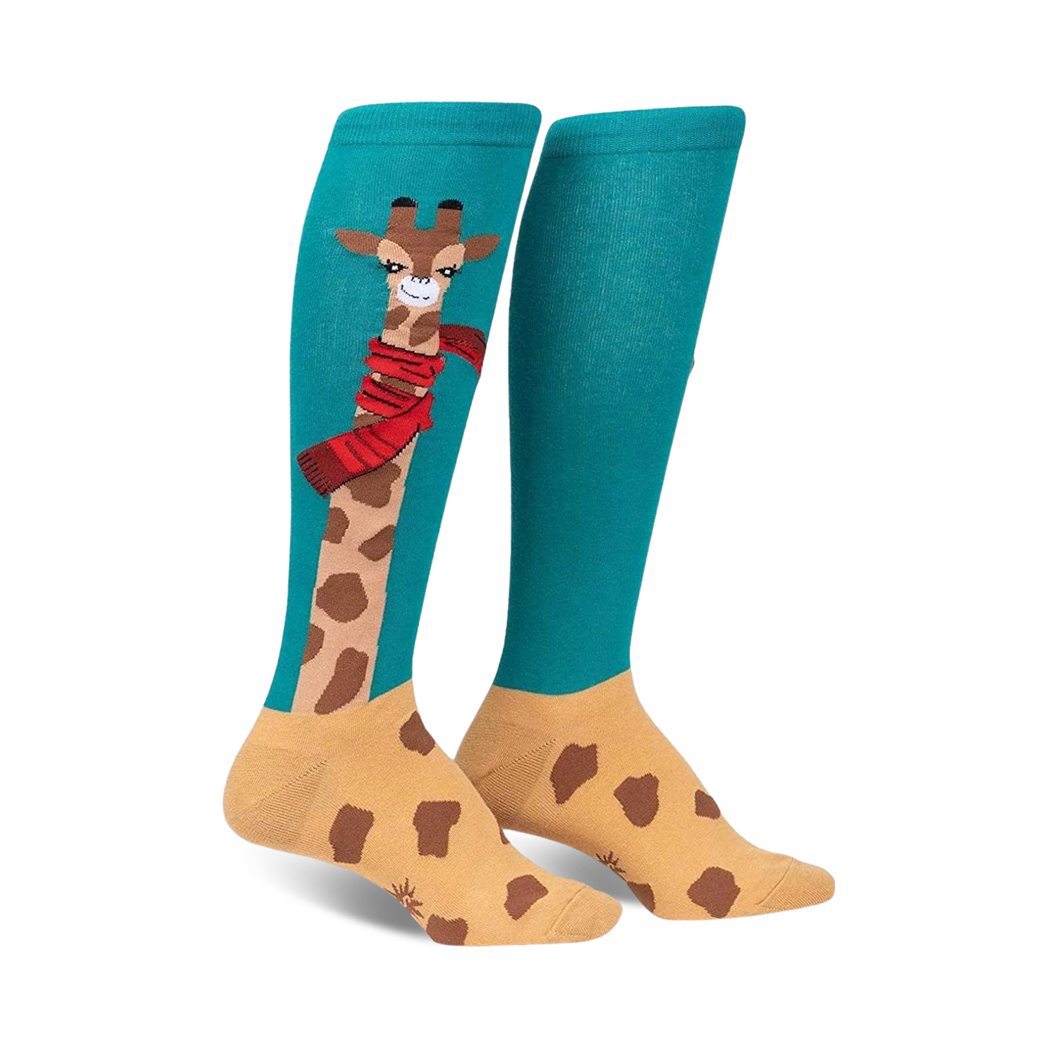 Strut your stuff in these Bundled Up Up Up giraffe socks! Say hello to the cutest giraffe you've ever seen, all bundled up in a cozy red scarf against a teal blue backdrop. Wear these knee-high socks and let your feet tell the tale of a giraffe's winter adventure. Show off your quirky side and bring a smile to everyone you meet. Because who says giraffes can't wear scarves?