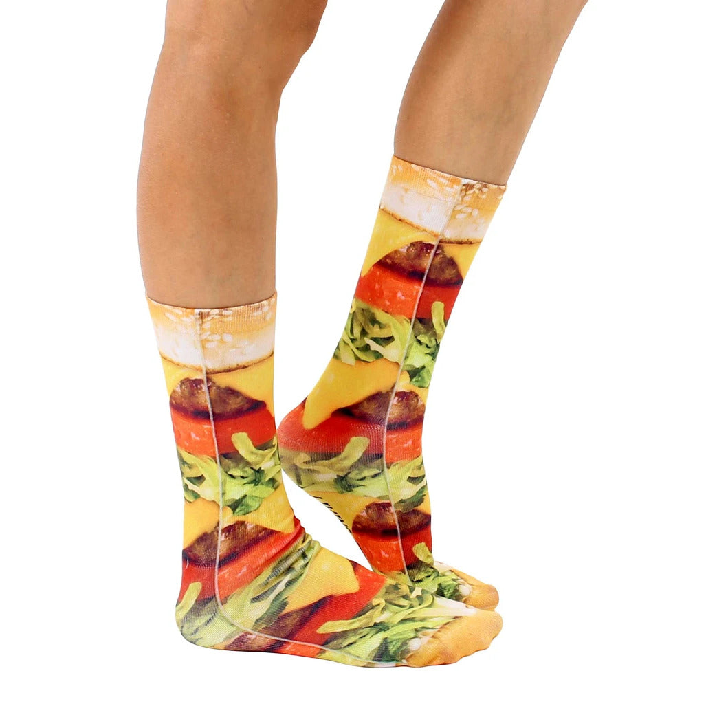 Buckle up and get ready for a burger bonanza with our Burger Love crew socks! These socks are a feast for your feet, featuring a scrumptious photorealistic print of a mouthwatering cheeseburger. You'll be the talk of the town (or at least the lunchroom) when you rock these bad boys. They're so delicious, you might just have a craving for a burger. Just don't try to take a bite out of your socks (unless you're really hungry). These socks are perfect for any burger aficionado or anyone who just wants to add a little fun to their sock drawer.
