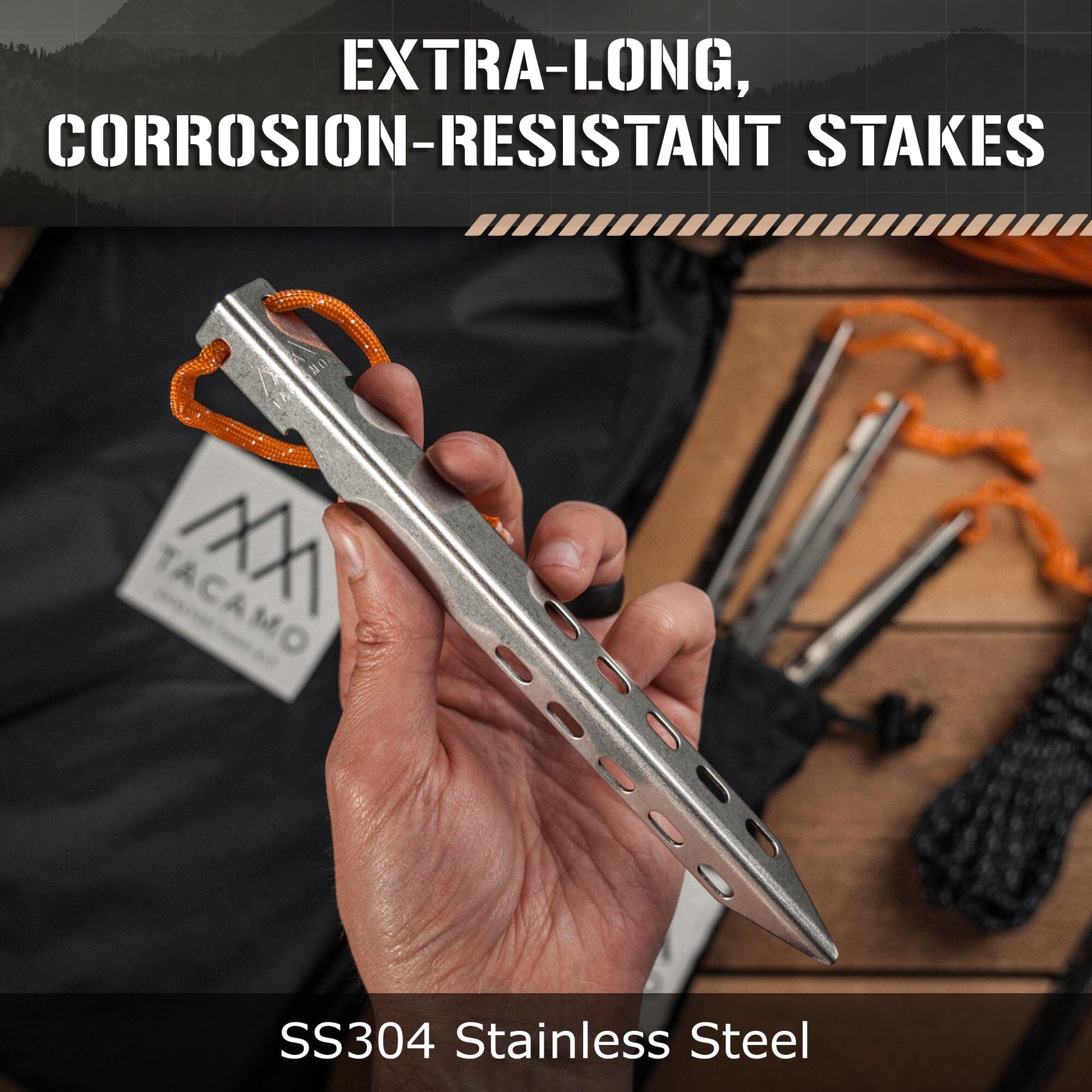 - DURABILITY YOU CAN RELY ON - Forget flimsy stakes that bend or pull loose in a storm. Our corrosion-resistant stainless steel stakes are wider and longer, anchoring your bushcraft tarp securely even in sandy or compact soil to keep your shelter stable during strong winds.