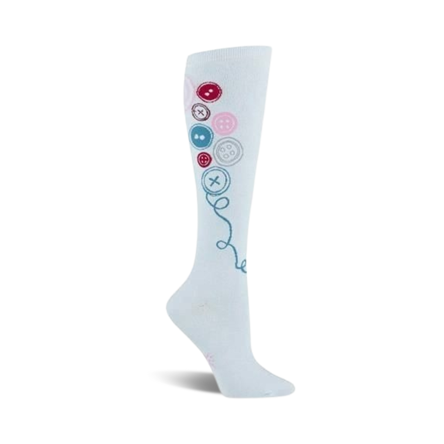 Everyone has lost a button once or twice in their life. Maybe you've even got a box full of spare buttons, just for that occasion…but you lost the box, too. No need to worry anymore! With these fun button novelty socks, you can wear them with confidence! Each cute pair has a white background and different colored buttons artfully displayed around the ankle area. These cute socks would make a great gift to the special crafter in your life!