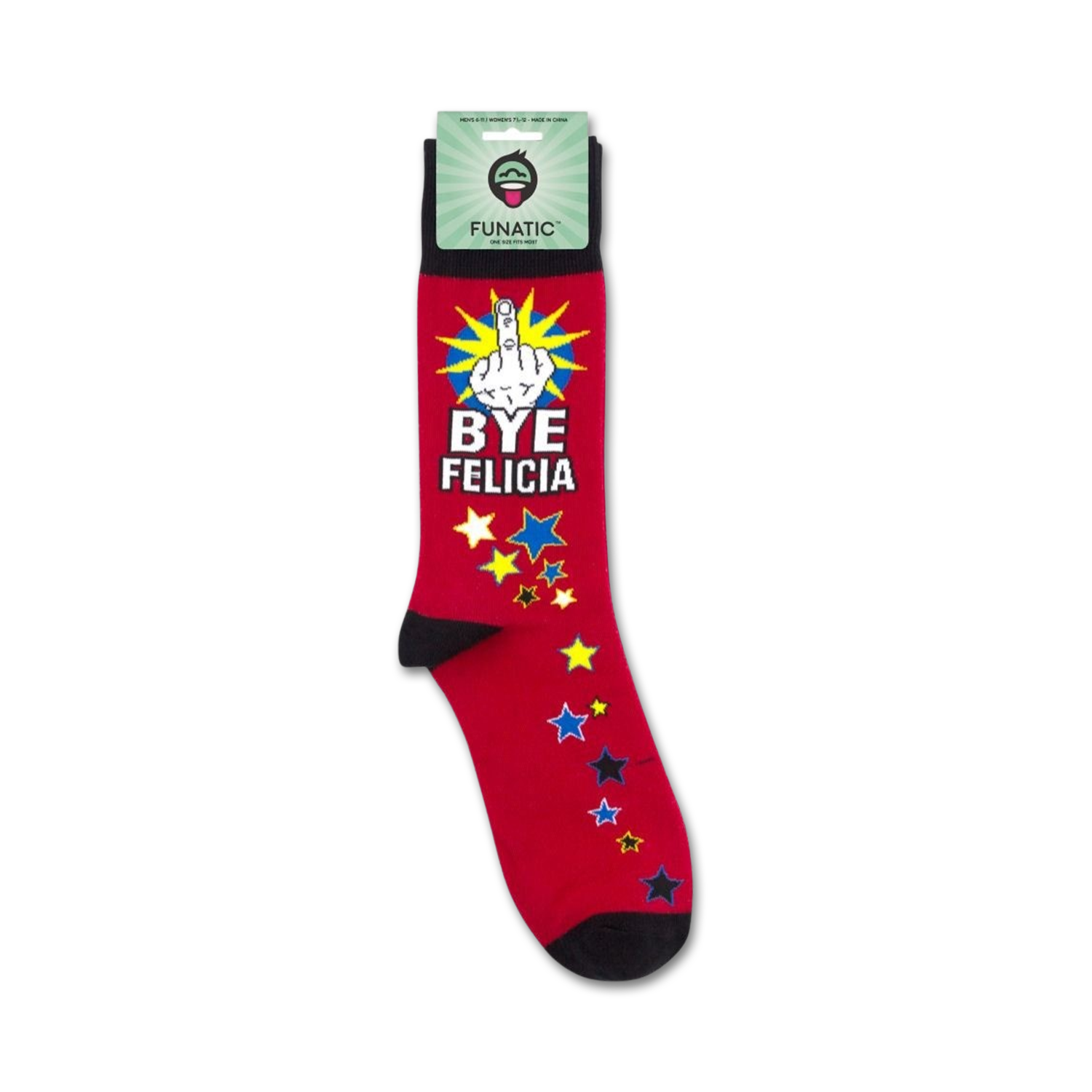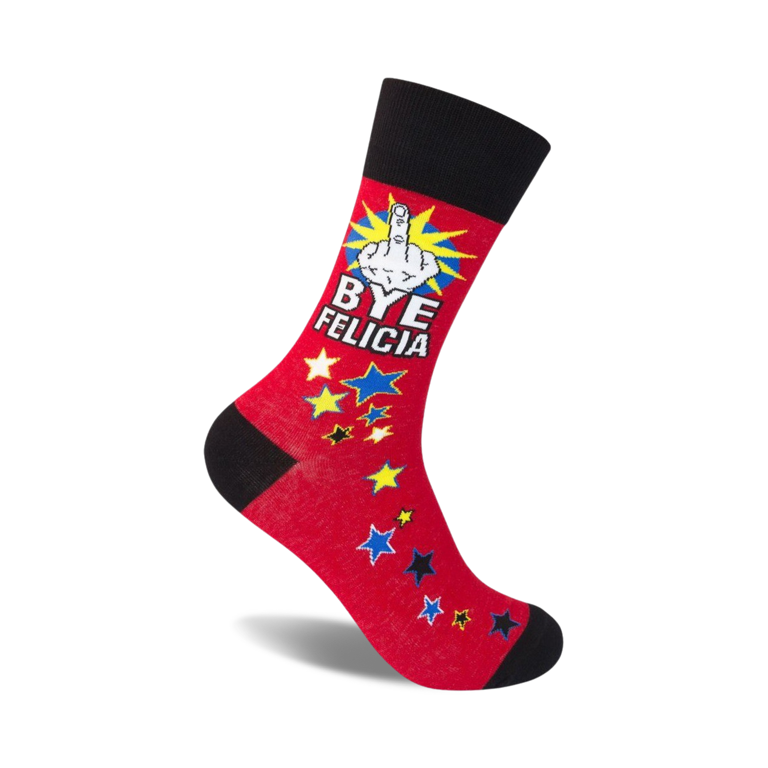 Sock it to 'em with Bye Felicia Crew Socks! Rock these red socks with black toes and heels, featuring a hilarious middle finger graphic in yellow with 'BYE FELICIA' boldly emblazoned around it. Scattered multi-colored stars add a playful touch. Perfect for men and women, these socks are a sassy way to say goodbye to negativity. Embrace the Friday vibes and let your feet do the talking!