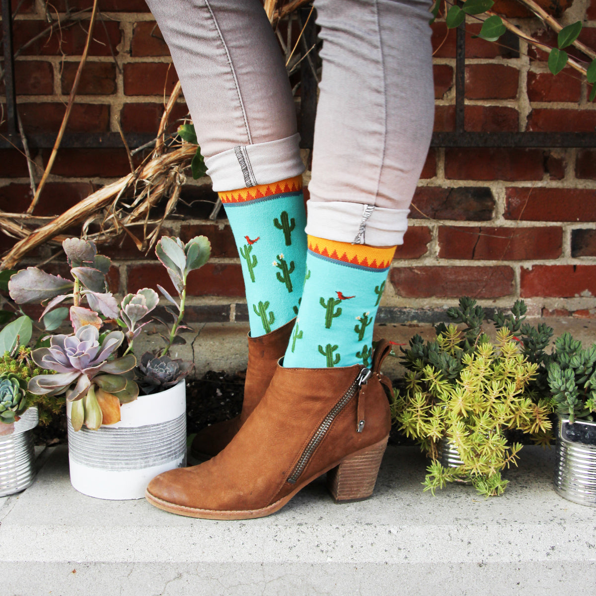 Get ready to have an udderly good time in these Cactus Crew socks! With a vibrant blue background, these socks boast a mischievous pattern of green cacti adorned with white flowers. And wait, did that red bird just land on one of the cacti? Talk about some serious attitude! These socks will bring some sunshine and a touch of prickly fun to any outfit. Trust me, they're so cool, you'll be tickled pink! /n