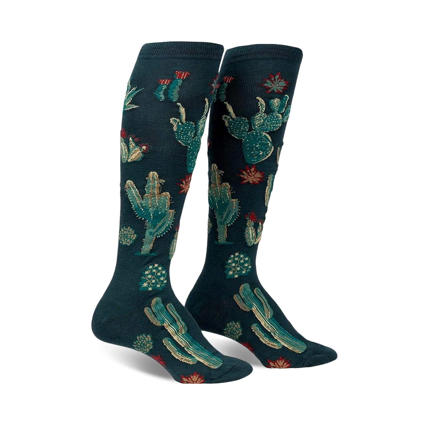 Transport your feet to a lush oasis with the Cactus Jungle knee-high socks! These desert-themed socks flaunt a vibrant display of cacti and flowers, blooming with personality and charm. Adorned in a captivating dark green backdrop, the knee-high design offers both comfort and style. Perfect for women who love nature, sunshine, and a touch of whimsy.