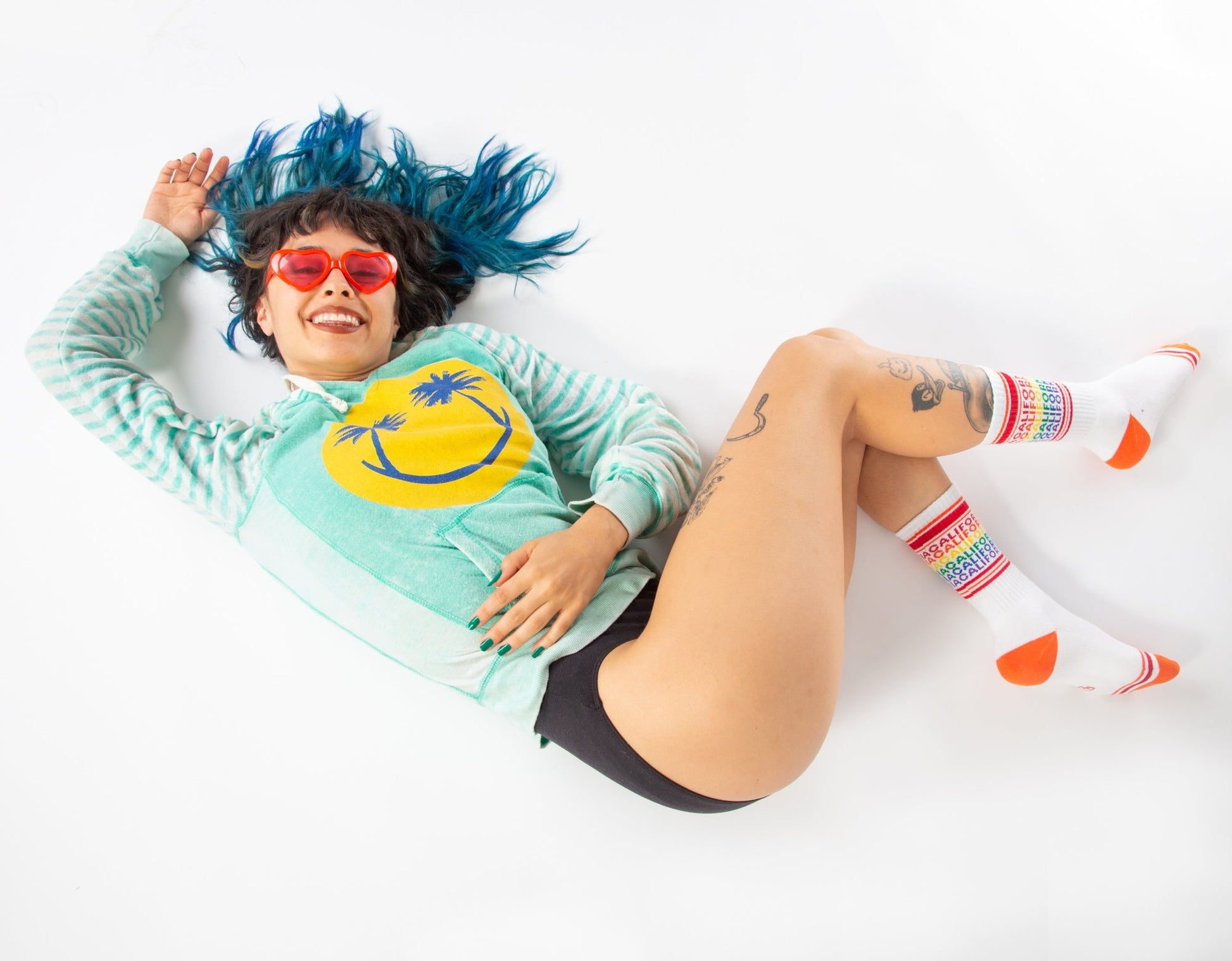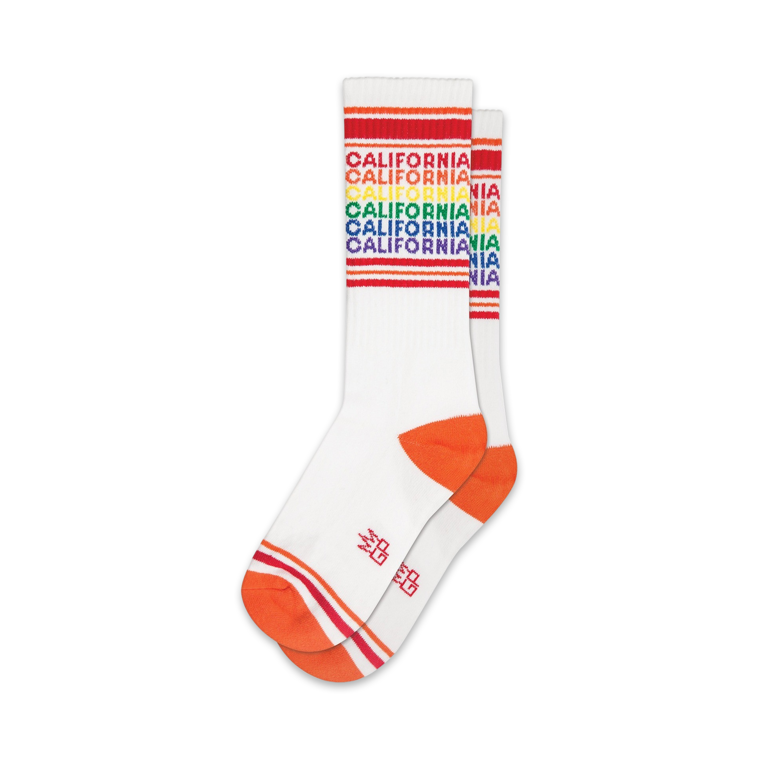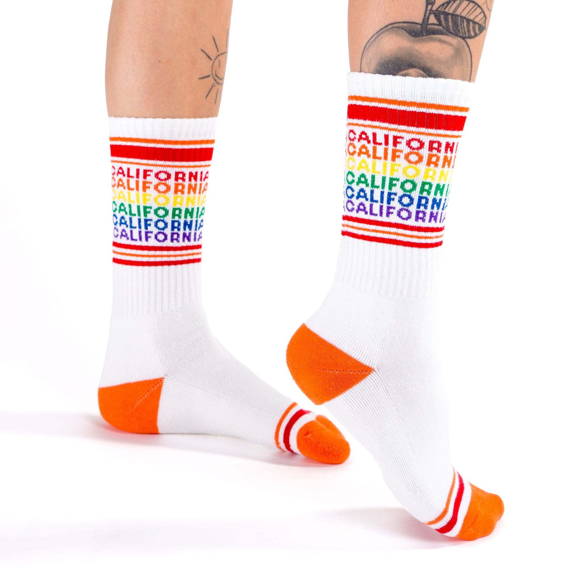 Show your love for the Golden State with these California rainbow state socks! White and rendered in big, fluffy letters stacked from toe to the top cuff of the socks, the word "CALIFORNIA" comes alive in neon orange, blue, yellow, and green. Two orange stripes adorn each sock above the ankle and an orange toe and heel completes the look. These extra long crew length socks are perfect for any native, transplant, or future sunshine state enthusiast!
