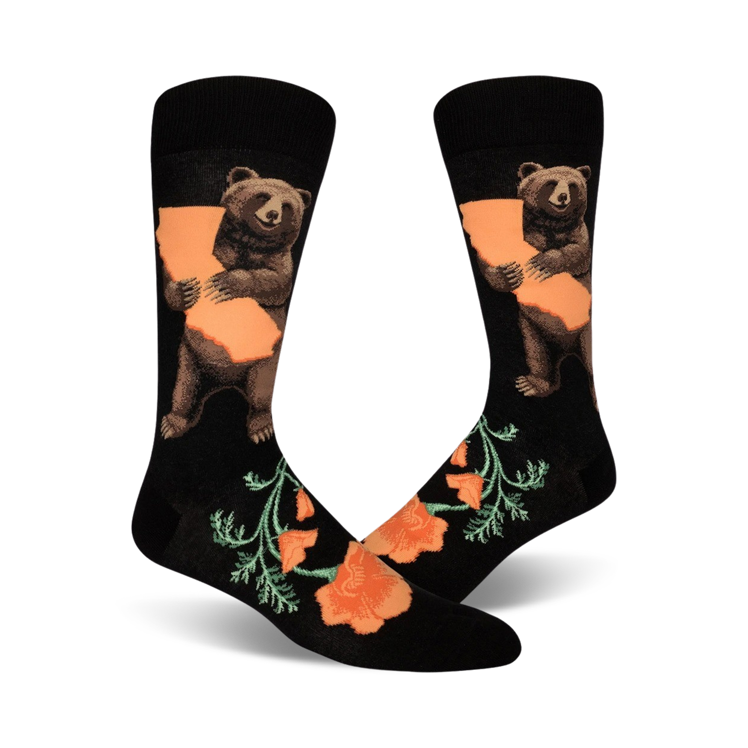 California Bear Hug: Crew socks for men with a pattern of brown bears hugging California, topped with orange accents like California poppies! Whether you're a native, a transplant, or just a fan of the Golden State, these socks will surely give you a warm, fuzzy feeling ”for your feet at least!