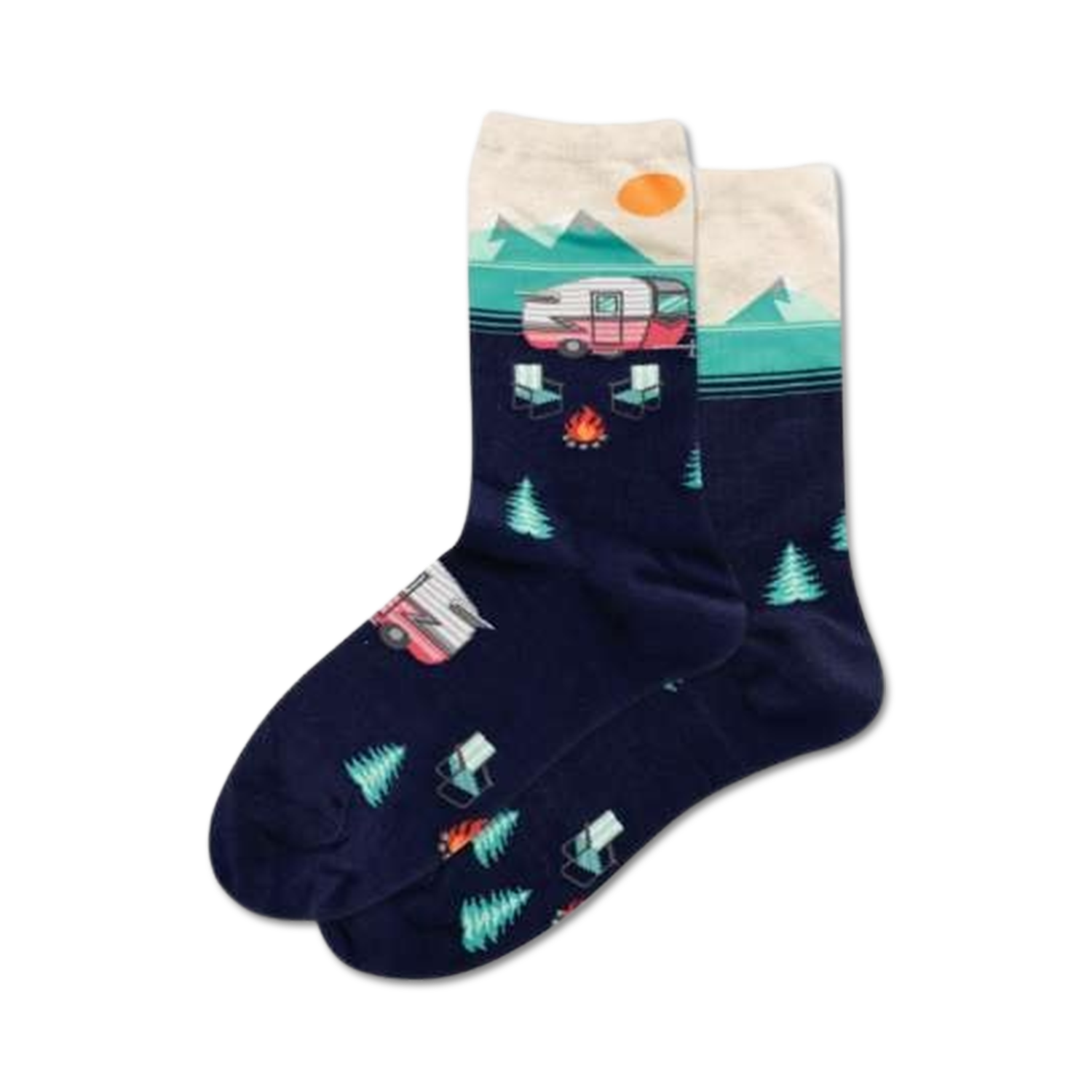 Attention, campers! Get ready for a hike through the majestic wilderness with our "Camper Scene" socks. Picture this: a vibrant design featuring a solo camper nestled amidst towering trees, a crackling campfire, and a setting sun casting golden hues across a mountain vista. These comfy crew socks are not just foot warmers, but mini works of art that bring the outdoors indoors. They're perfect for when you need a touch of adventure without leaving your couch. Put on a pair, and let your feet do the trekking!
