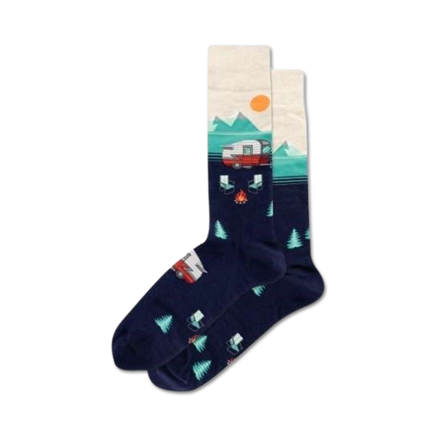Ready to pitch your tent and set up camp? These socks are chock full of camping fun. Featuring a camper, two chairs, trees, and an evening campfire, all under a gorgeous sunset. If this description doesn't get your fire going, we don't know what will!