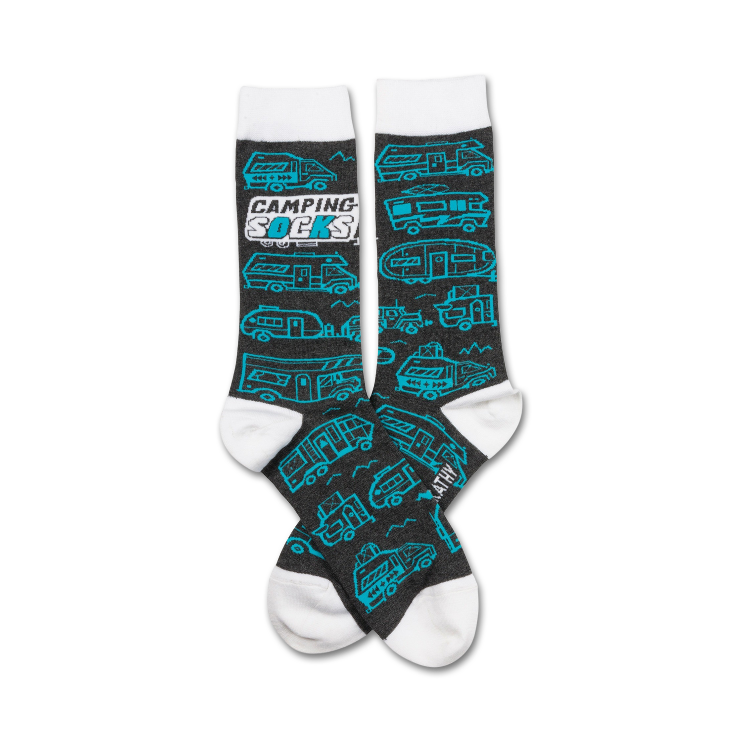 Get ready for a wild adventure with our Camping Crew Socks! Join the happy campers as they embark on their outdoor expeditions. These gray socks, with their white toe, heel, and top, feature a vibrant pattern of blue and black campers including vans, trailers, and RVs. Whether you're a seasoned hiker, a glamping enthusiast, or just love the great outdoors, these socks will add a touch of fun to your next camping trip. Get your feet in on the adventure today!