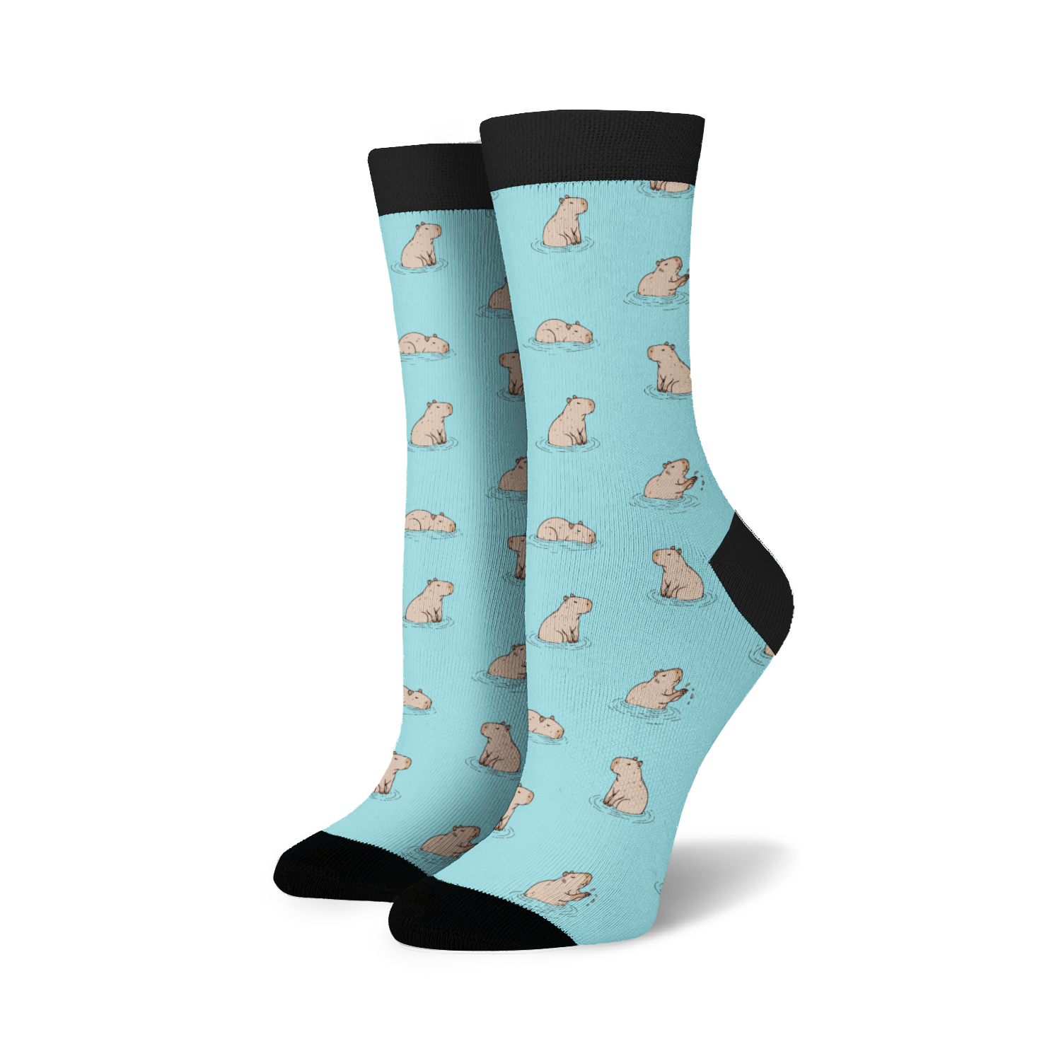 Get ready to dive into cuteness with Capybara Crew Socks! These blue socks are adorned with a pattern of cartoon capybaras swimming in a light blue pond. Capybaras are the world's largest rodents, but don't let their size fool you. They're known for their playful and friendly nature, just like these cozy socks. Available in sizes for both men and women, these socks are the perfect way to add a touch of fun to your everyday wardrobe. Slip into a pair and let the capybaras take you on a whimsical adventure with every step.