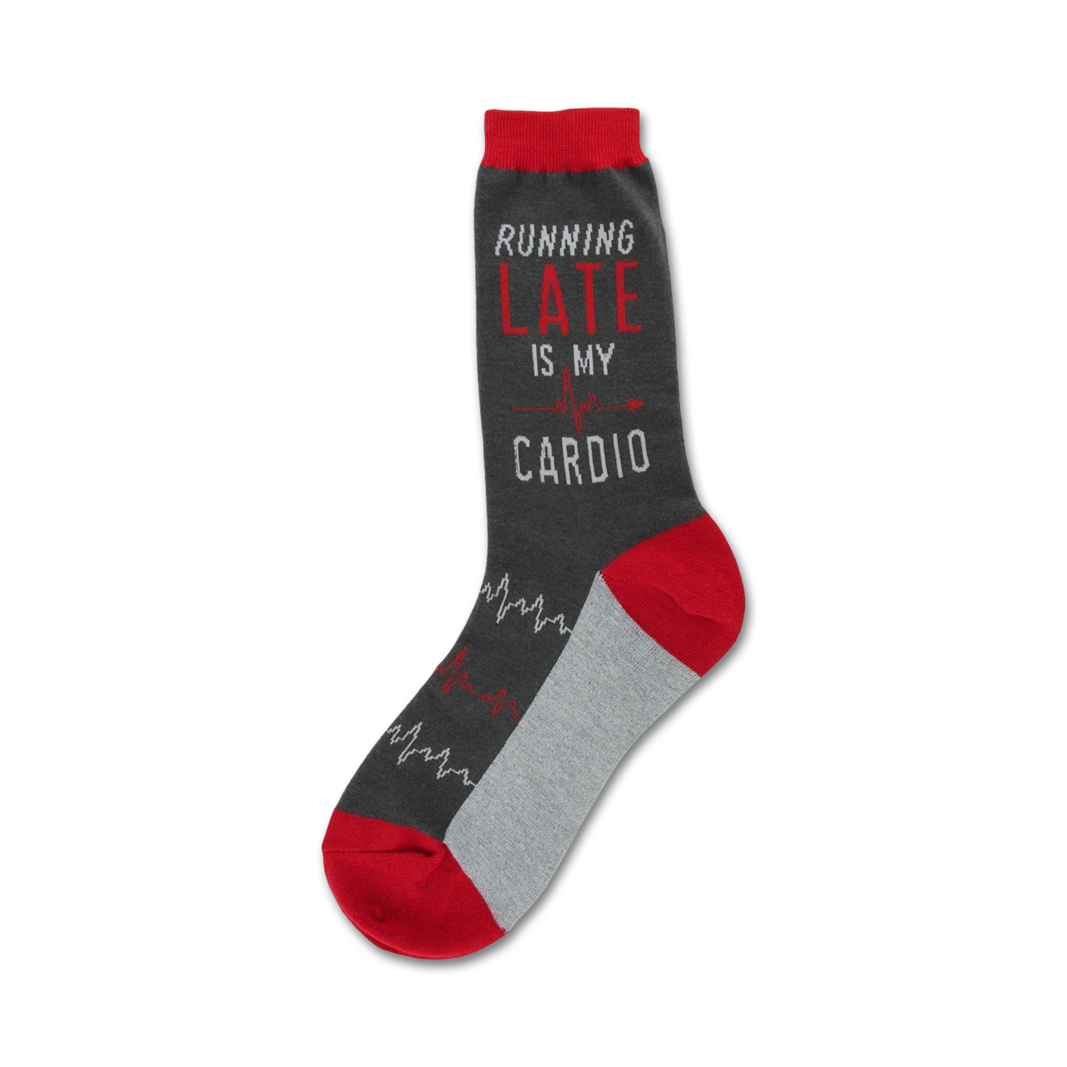 Cardio Crew Socks: These socks are the ultimate workout wear for anyone who loves to take it easy. 'Running late is my cardio' is emblazoned on these gray crew socks with red and white text. Perfect for the gym or a lazy day on the couch, these socks let everyone know exactly what your fitness routine really is.