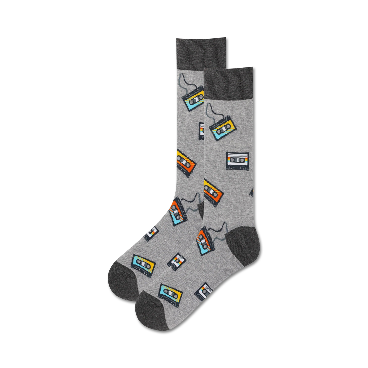 Cassette Tape Socks: Show off your love for mixtapes and the 80s with these funky and fresh crew socks. You're guaranteed to walk to the beat of your own drum with these gray socks featuring a pattern of multicolored cassette tapes. Cassette Tape Socks: Walk to the beat of your own drum.