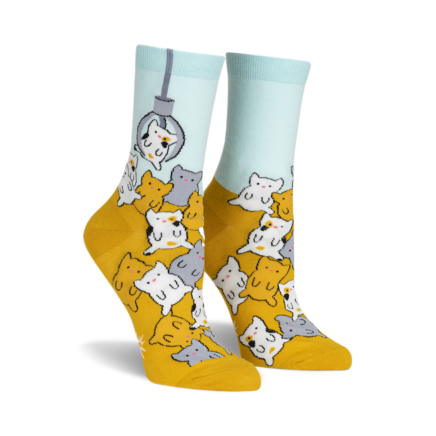 Get your paws on our Cat Claw socks, where fun meets quirky in every step! Featuring a playful pattern of cats snagged by claw grabbers, these socks are a riot of colors against a vibrant yellow backdrop. The light blue cuff adds a pop of cool contrast, making these socks perfect for livening up your daily wardrobe or gifting to your feline-loving friends. Whether you're lounging around the house, jazzing up your work attire, or stepping out for a casual rendezvous, these socks ensure you carry a dose of whimsy wherever you go. Who says you can't have a claw-some day, every day? Grab these socks and let your feet do the talking!