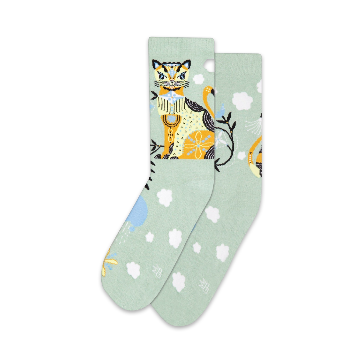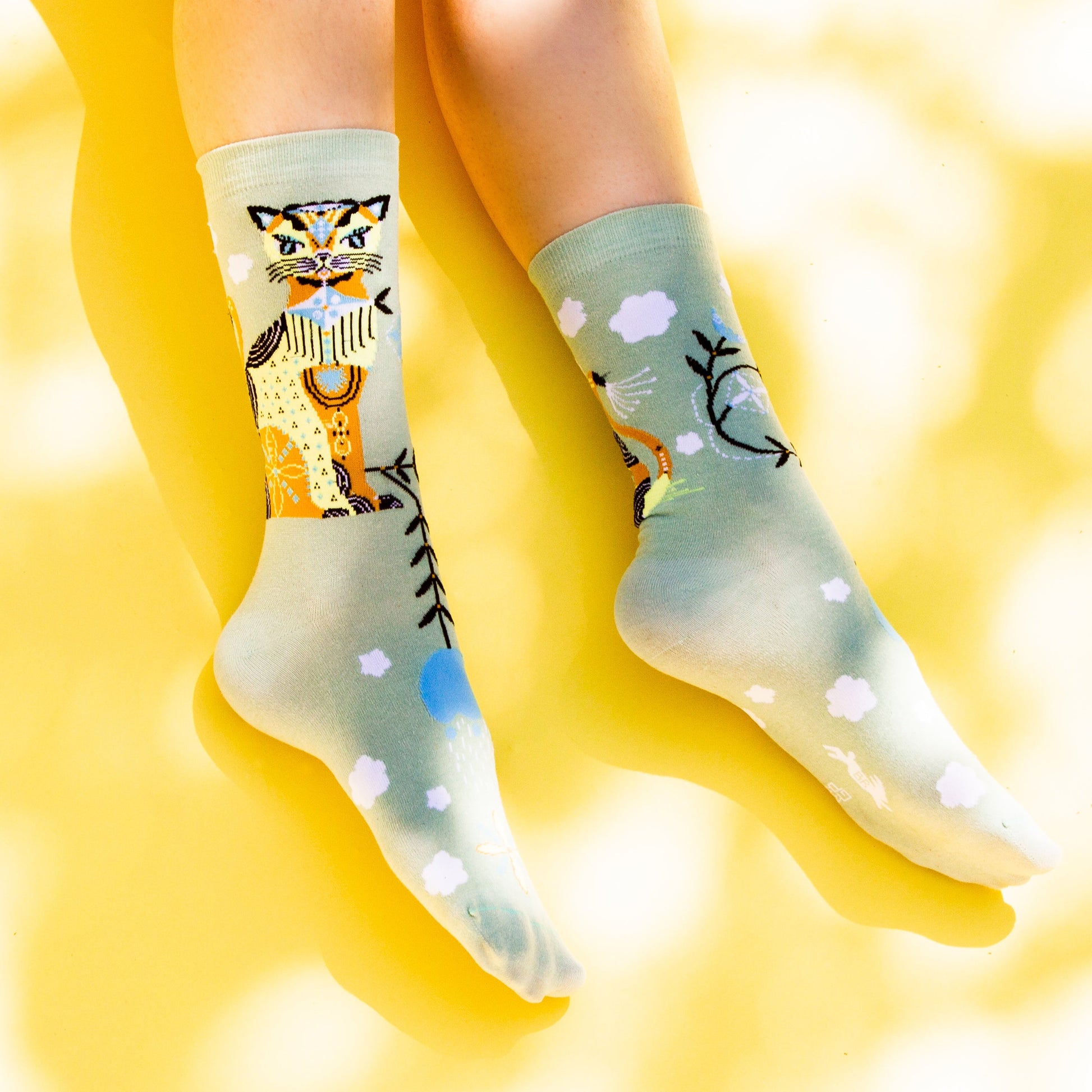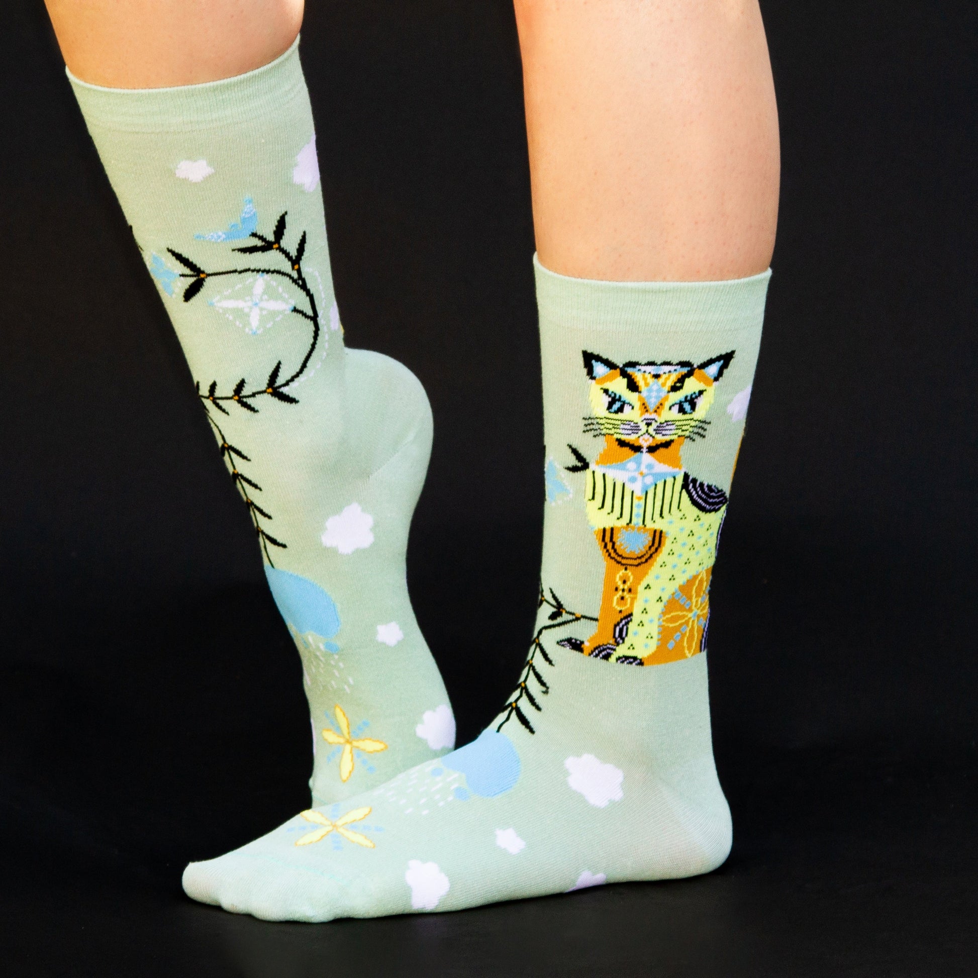 Cat & Clouds Crew XL Socks: Unleash Your Inner Feline Charm! Cruise through the day in these "Cat & Clouds" socks that bring a dash of whimsical fun to your feet! Adorned with mischievous orange cats frolicking amidst fluffy white clouds against a refreshing mint-green backdrop, these socks are sure to be-cat-ch your fancy! Whether you're lounging at home or strutting your stuff on the town, these comfy, crew-length socks are the purr-fect way to showcase your paws-itivity! Step into a world of feline enchantment with Cat & Clouds socks, and be prepared to steal the spotlight, one paw at a time.