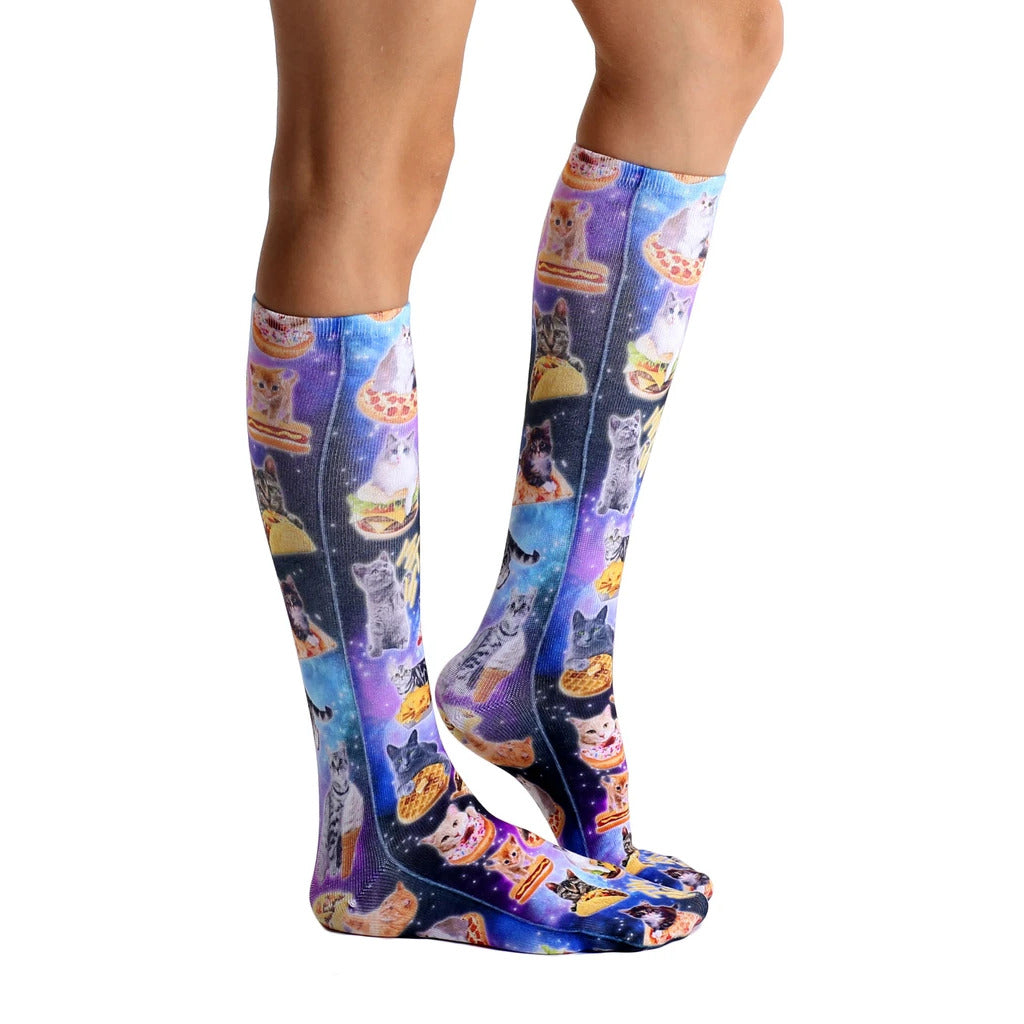Who's hungry for style? Cat Cravings socks have got the flavor you need! Stuffed with an all-over pattern of cats dressed to the nines in ridiculous costumes, chowing down on their favorite foods popcorn, pizza, sushi, burgers, oh my! The colors are as bold and vibrant as your appetite with bright blues, greens, pinks, and yellows popping against a backdrop of starry blue skies. Don your Cat Cravings socks and prepare to steal the spotlight as these knee-high wonders turn every step into a feast for the eyes.