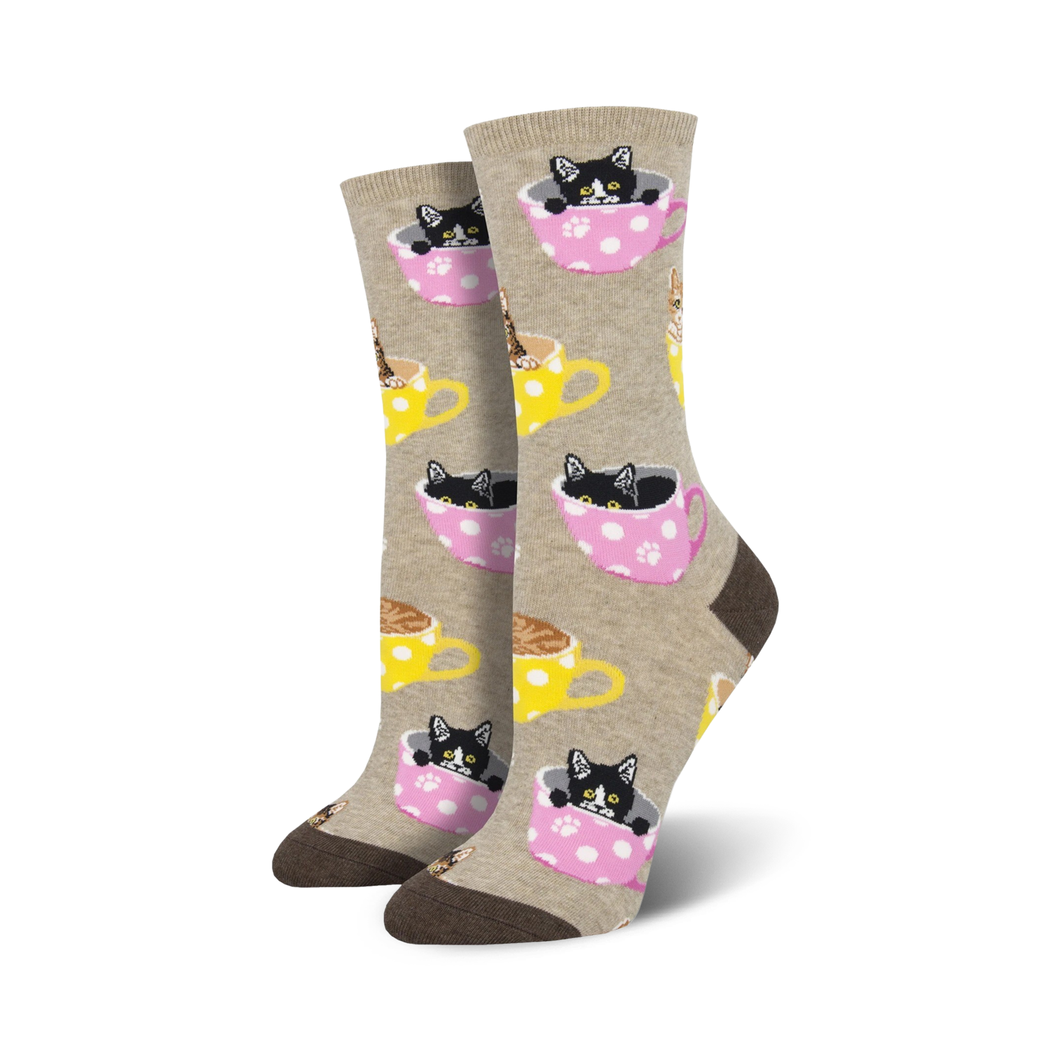 These meow-velous Cat-Feinated socks will fur-ociously brighten your day! These light brown crew socks feature a pattern of pink polka dot tea cups with cats tucked cozily inside. You'll be feline fine and looking extra dapper once you slip these adorable cat-titude socks on your feet.