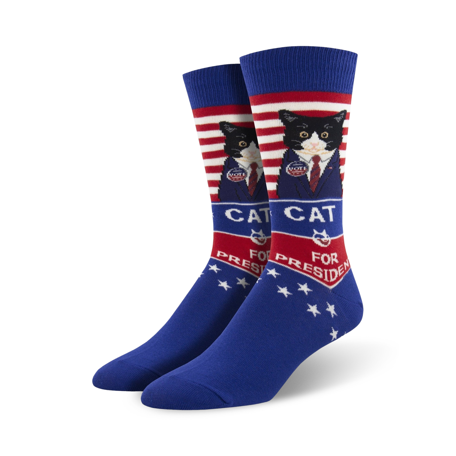 Cat For President Socks: Show Your Support With Socks! These red, white, and blue socks feature a suited cat running for president. With five stars on each side of the word "PRESIDENT" and the cat wearing a vote button, these socks will get you ready for election day in style.