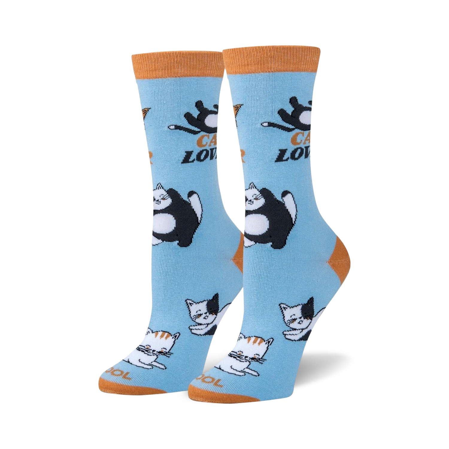 Let's take a trip to the land of whimsy! Picture this: socks with cartoon characters being real cool cats. Meet our "Cat Lover" socks, a crew-length fun-fest for the feline-obsessed! With black, white, and orange cartoon cats strutting their stuff, these socks will leave you purr-fectly satisfied. You'll be swinging your toes like a rockstar while showing off your love for cats! Meow, let's pounce on a pair today!