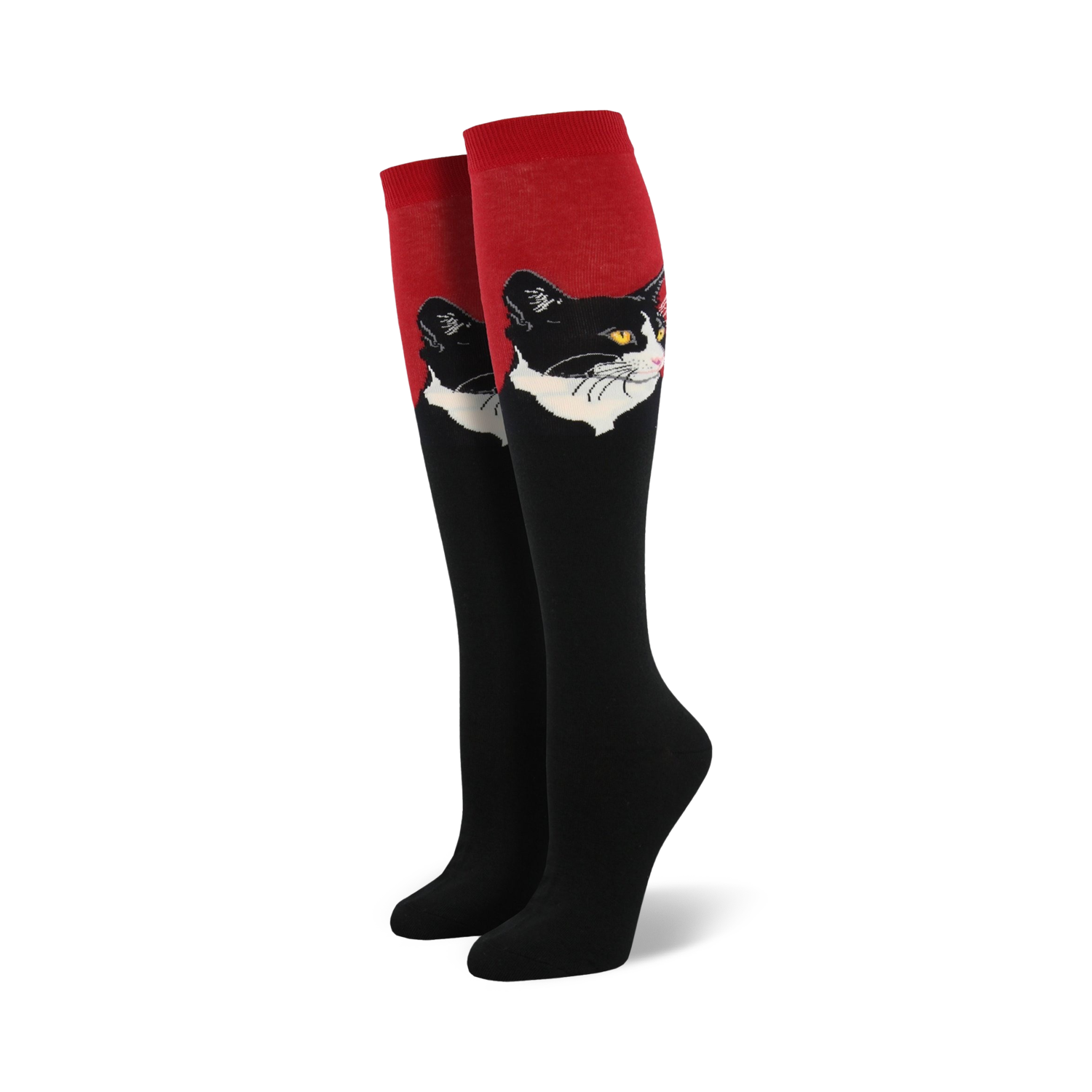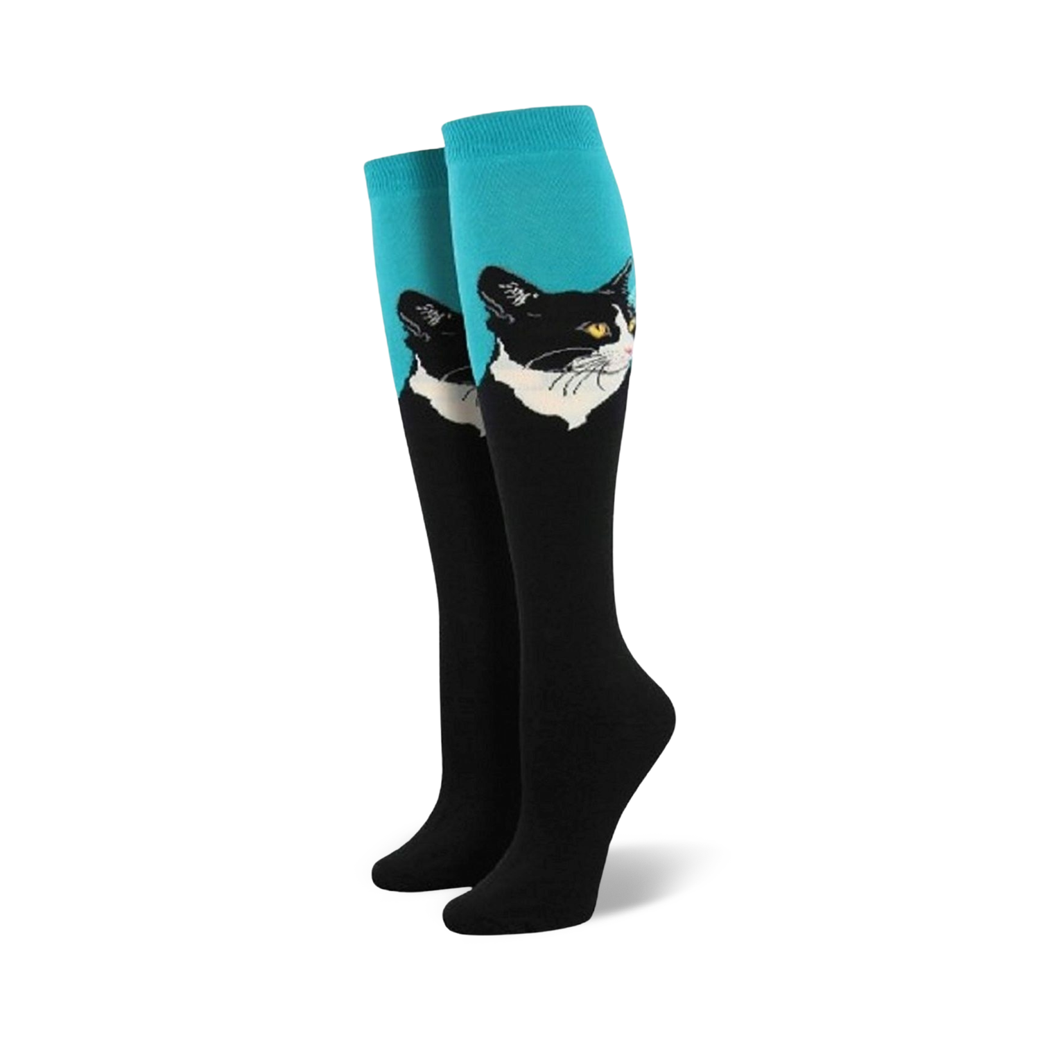 A sophisticated cat is sophistiCATed. These super cool knee high socks will have all the kitties purring at your feet! Each lovey sock is two-toned with black and teal blue with a curious looking black and white cat splitting the colors. Wearing these awesome feet warmers will surely have you feline fine! Meeeow!