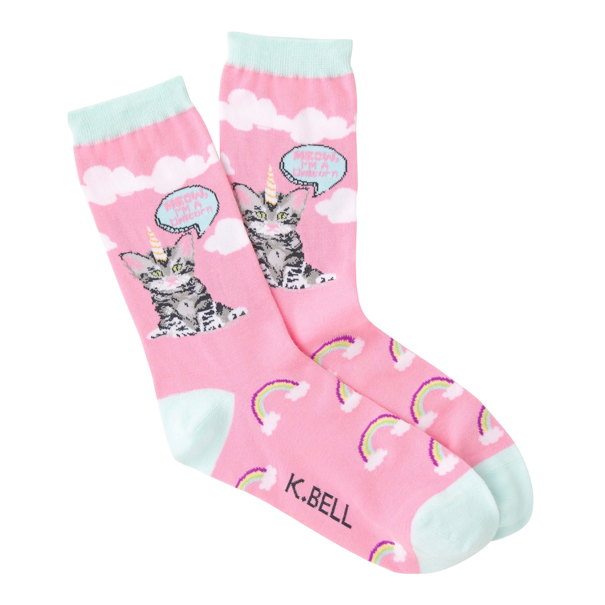 Chase the rainbow and bat it around the room with your two front paws! This pair of cute socks will have you magically purring with excitement. Each fun pink crew sock features a print of little rainbows, fluffy clouds, and a kitten with a unicorn horn saying "Meow, I'm a Unicorn"
