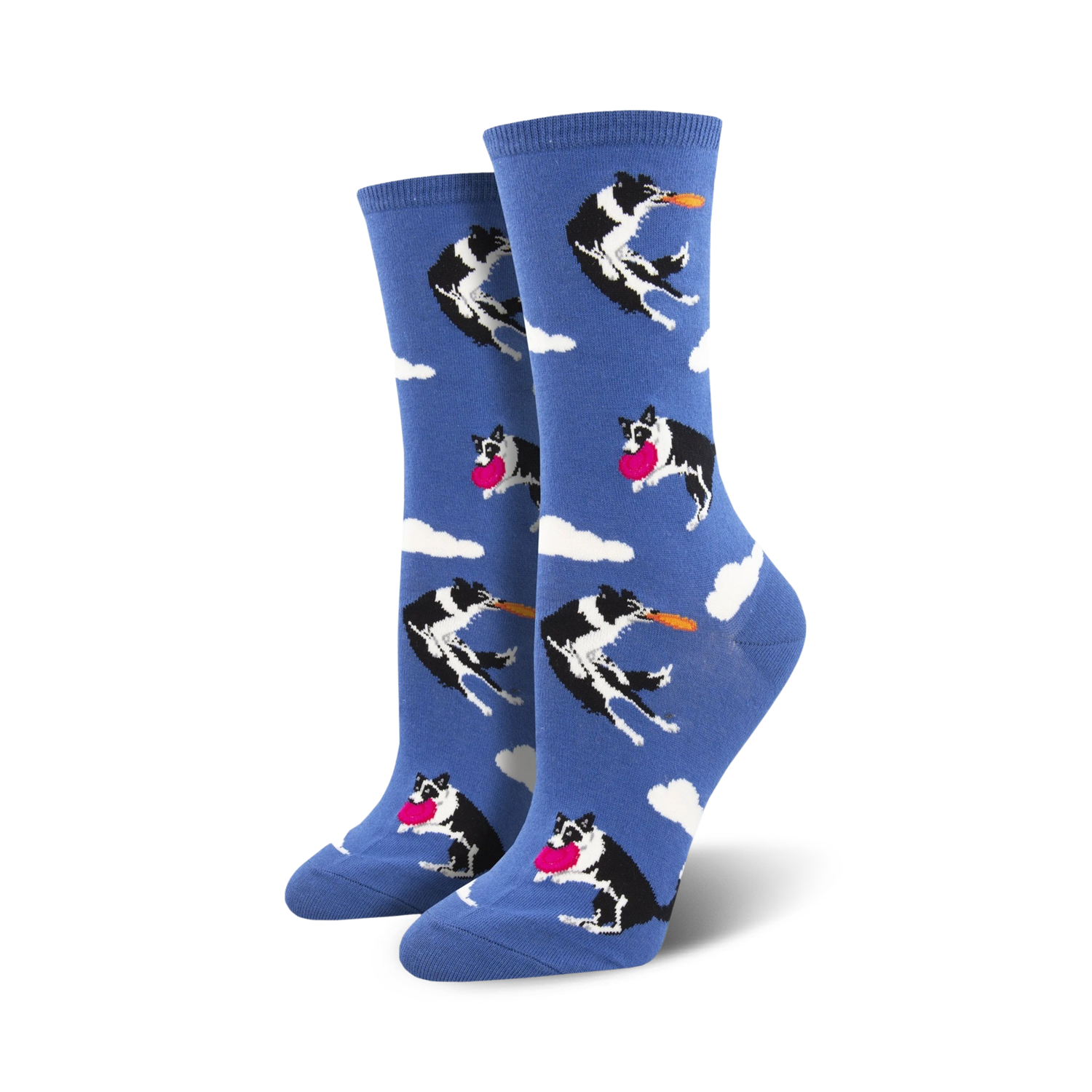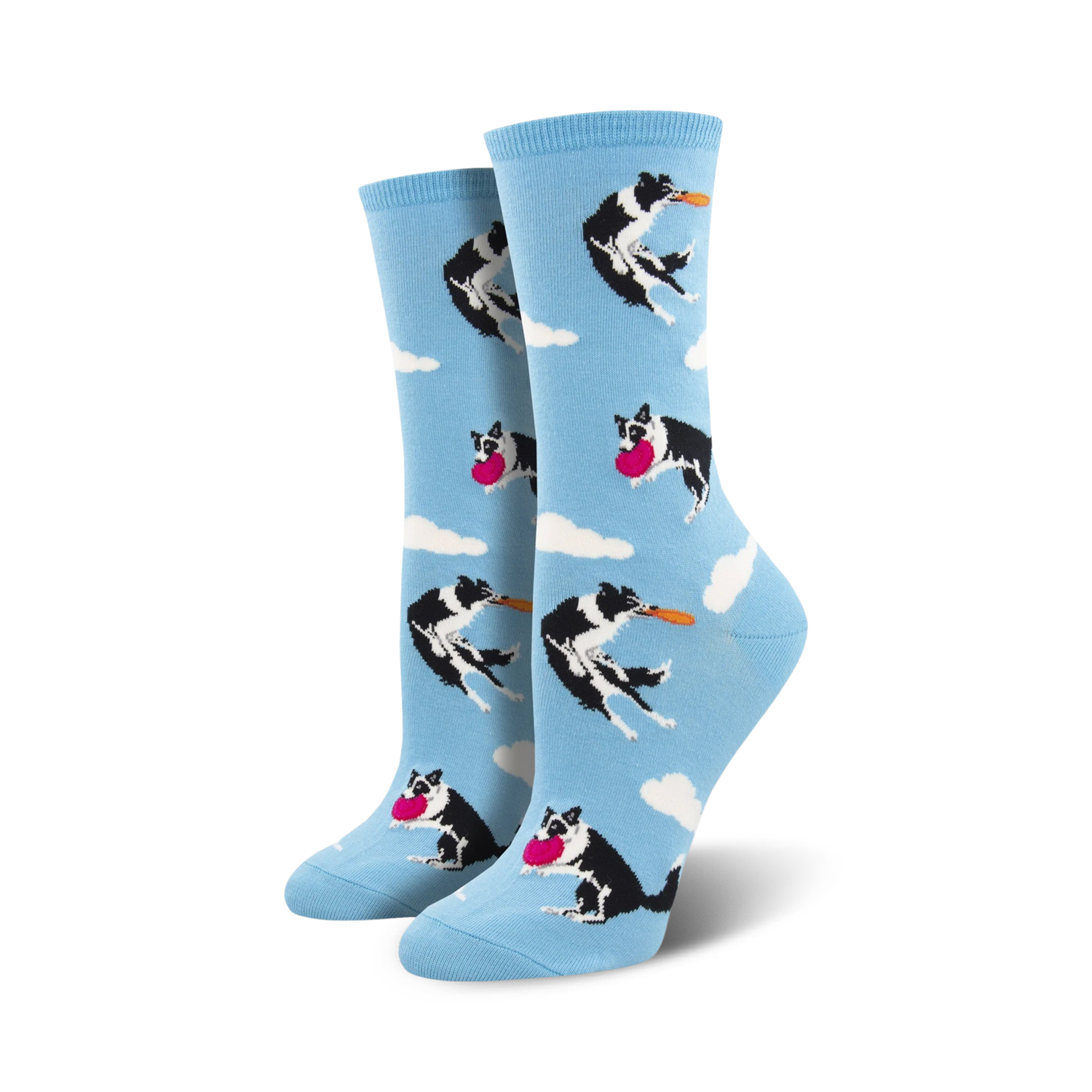Who let the dogs out?! You did with these Catch Your Drift socks. Tis the season to be leaping with these Border Collies frolicking in the beautiful light blue sky. Paws up for the softest crew socks that are sure to take you places, but if you lose your way, no worries, these pups were taught to track. Coming in women's sizes, you can actually teach an old dog new tricks with these comfy socks. Dog gone, they're so cute you might forget to take them off. Eat, sleep, fetch, repeat and add these to your sock drawer today!